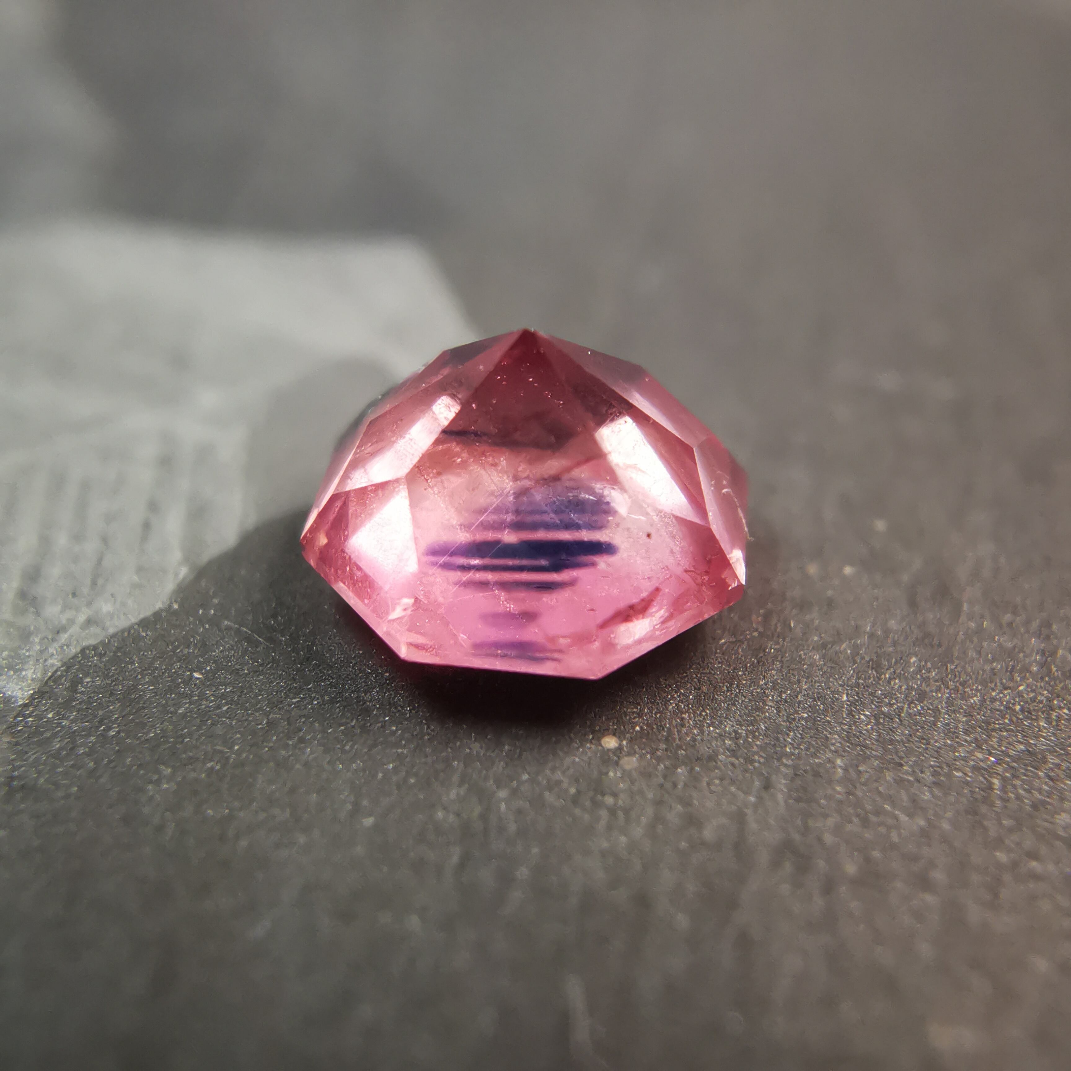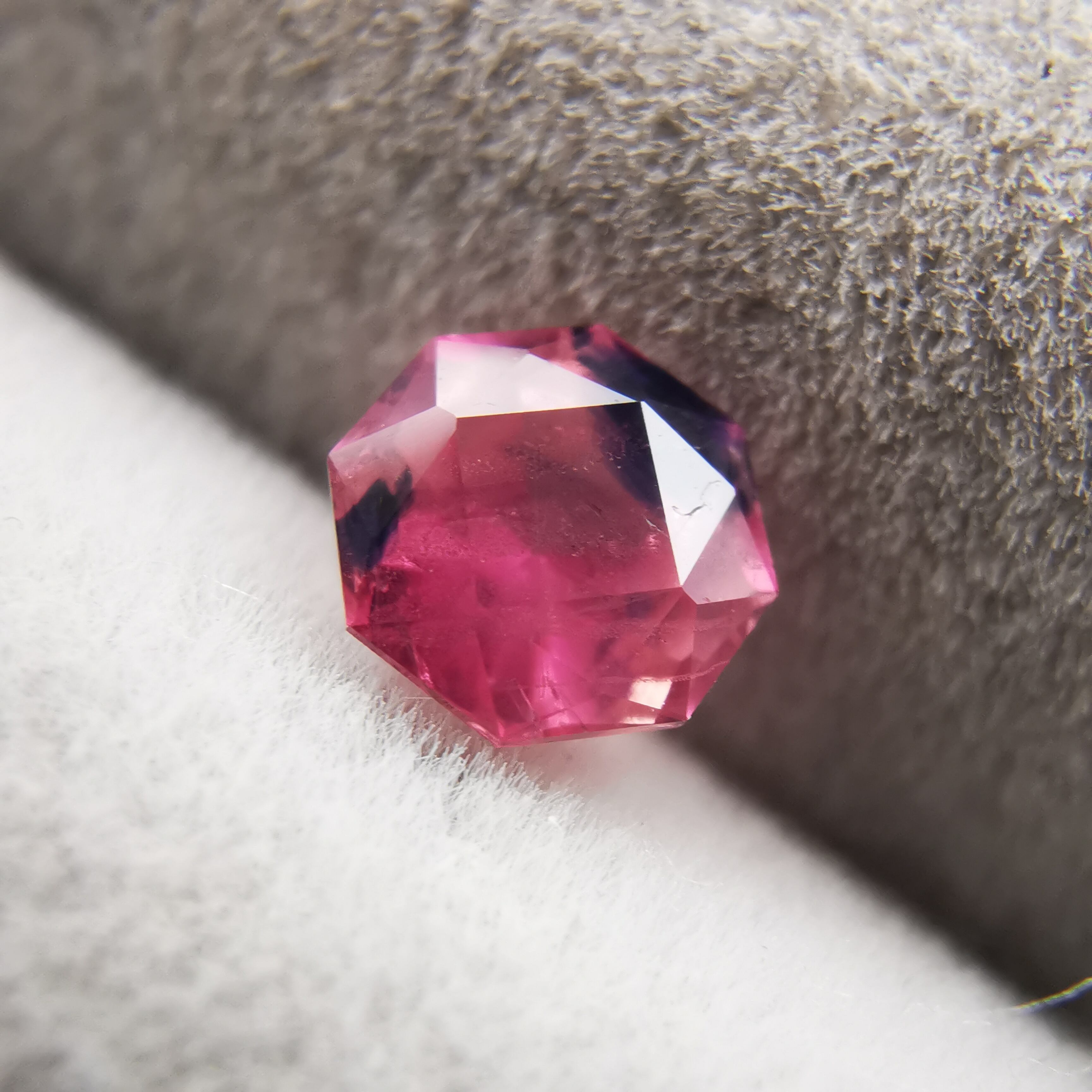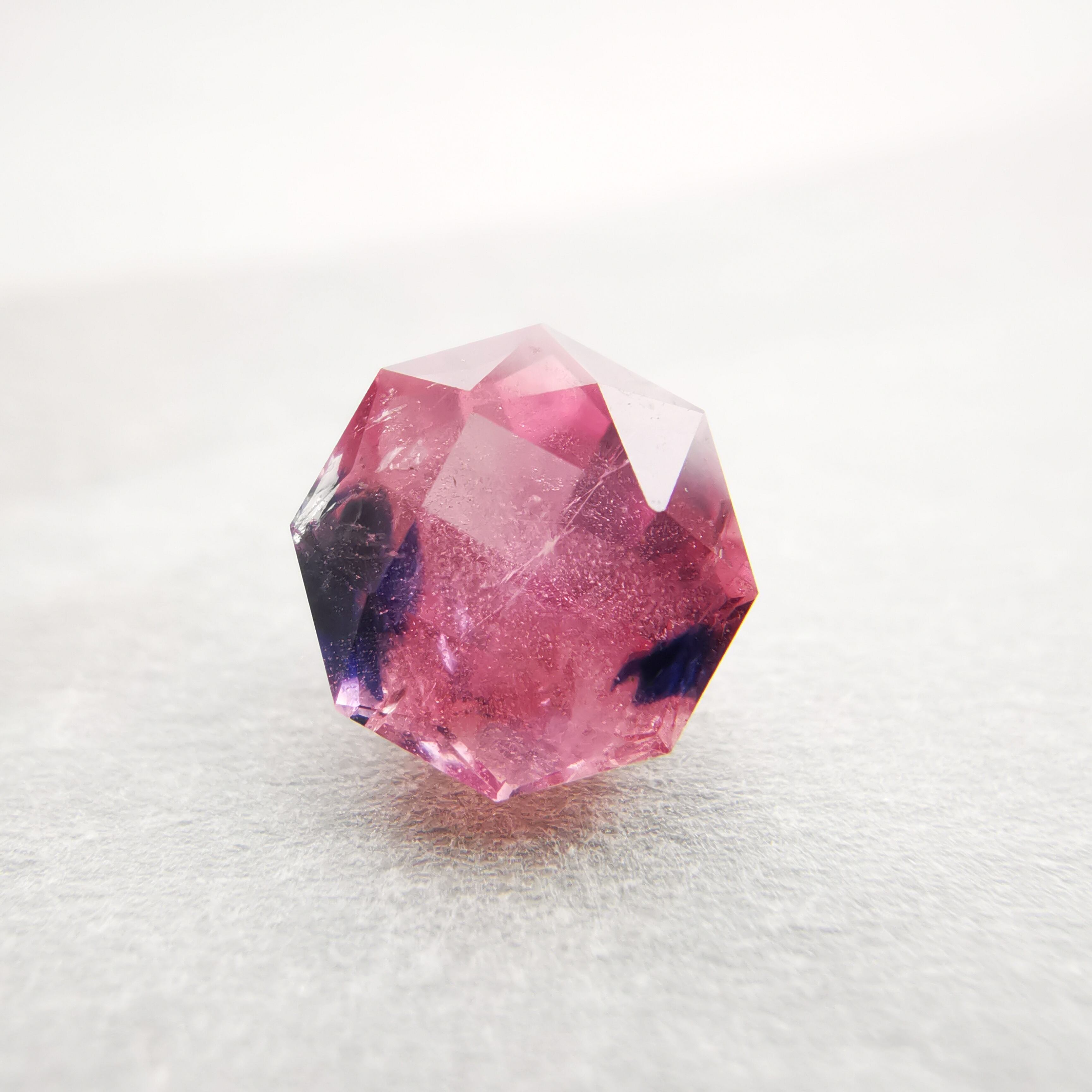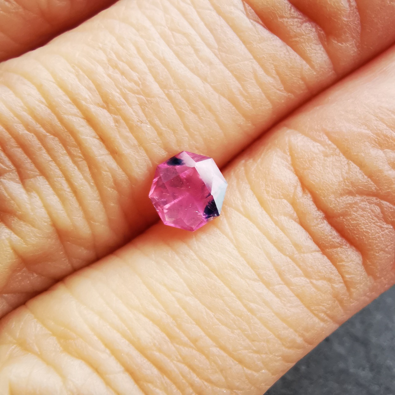 もやっとした石の中から、チェリーピンクがきらめき、ちょんと二か所入った濃いブルーが主張するサファイアです。