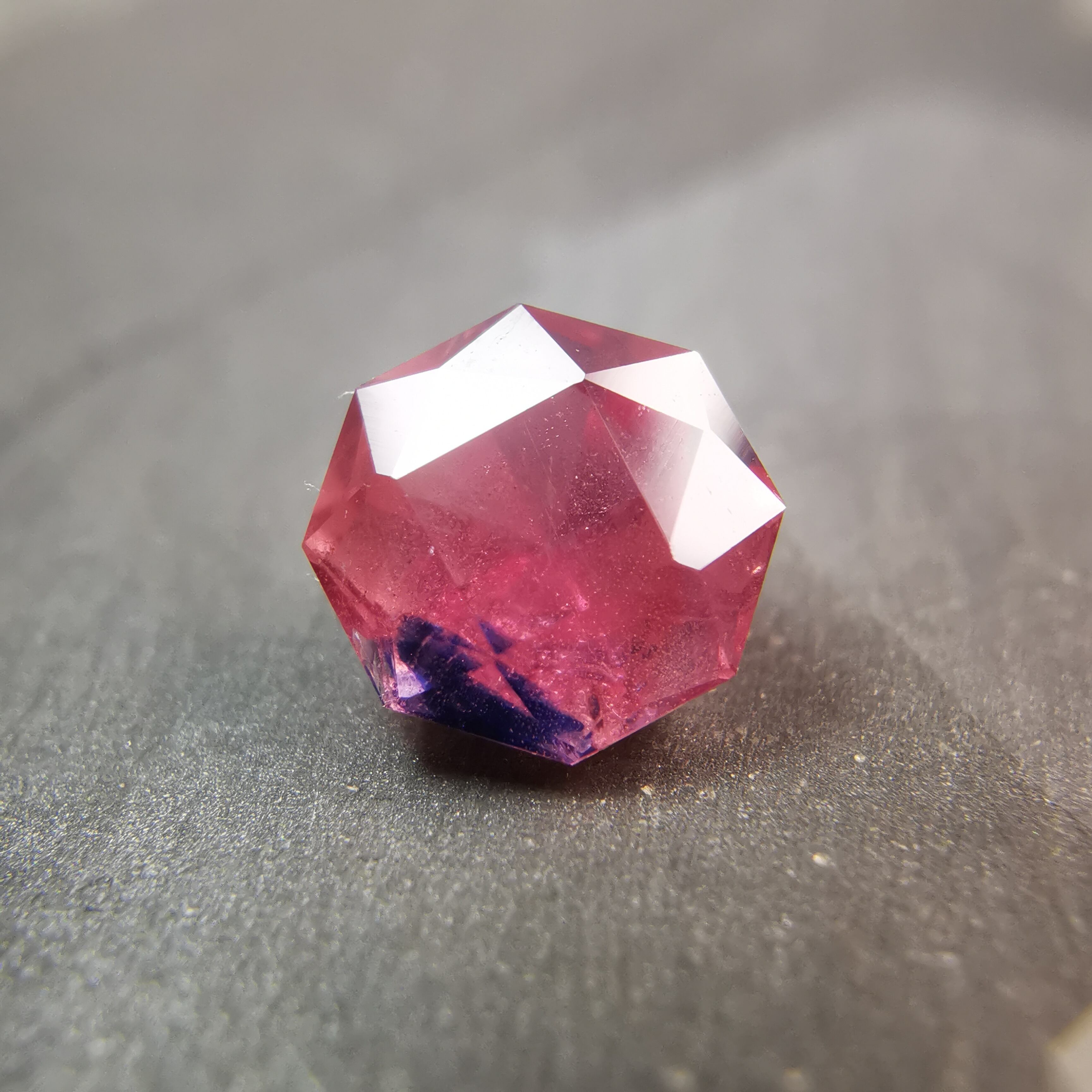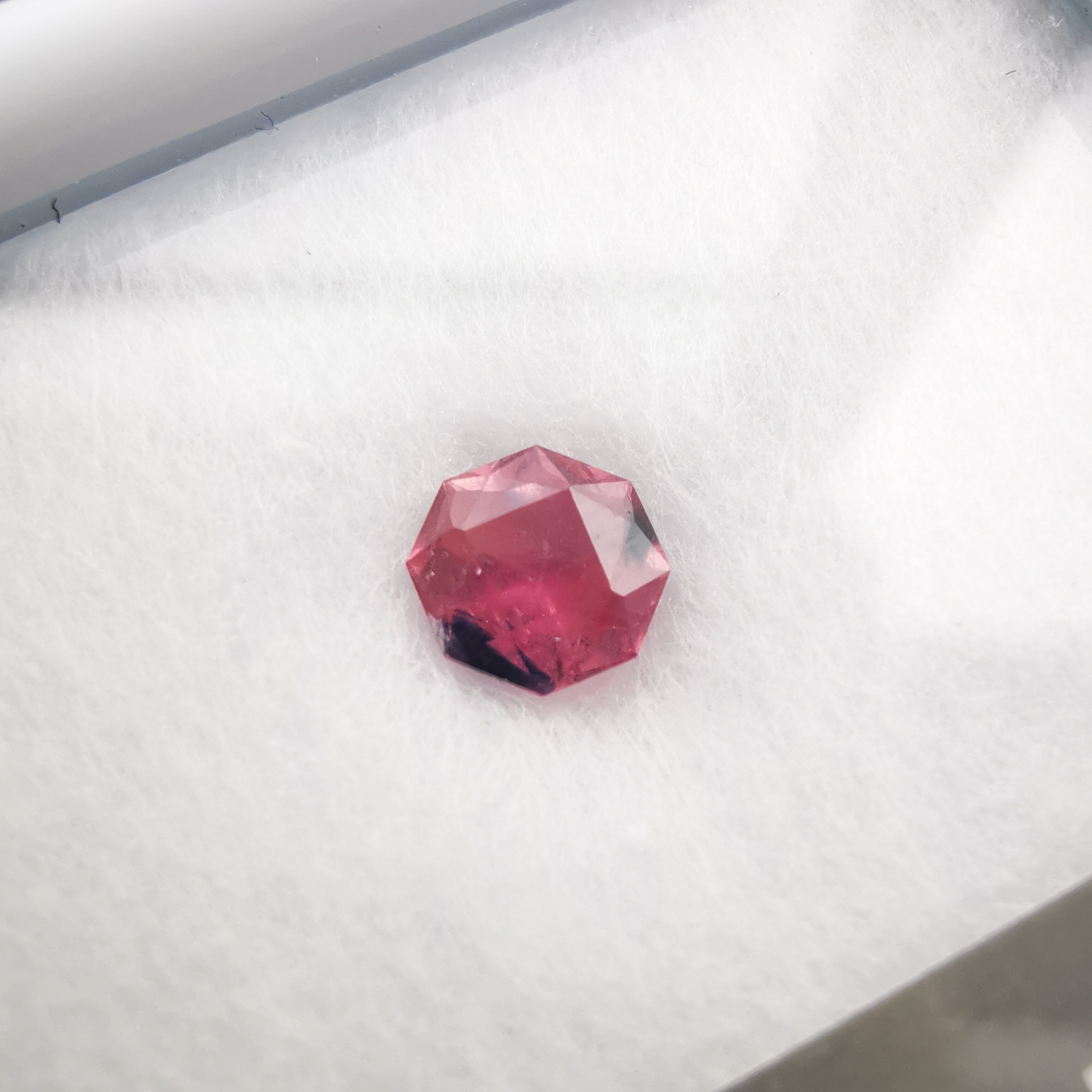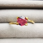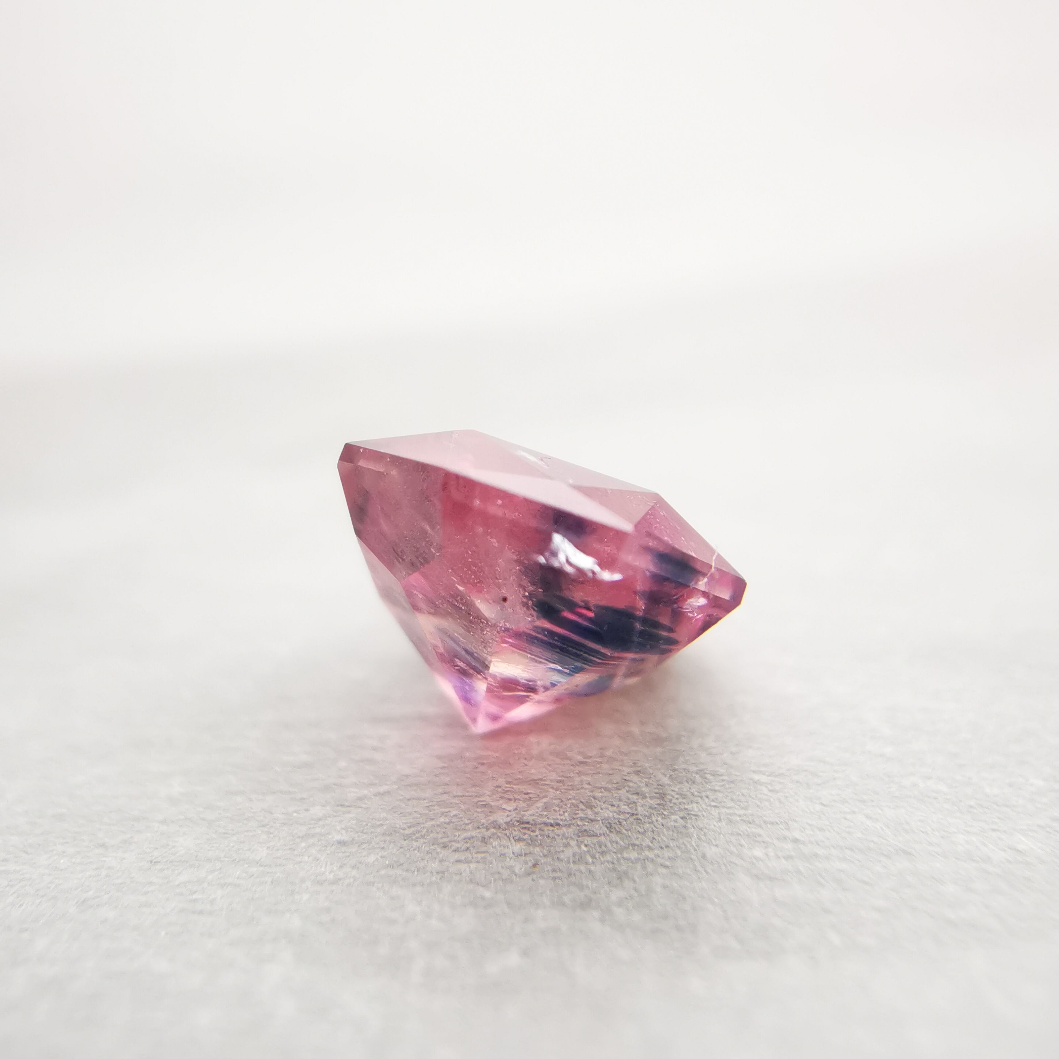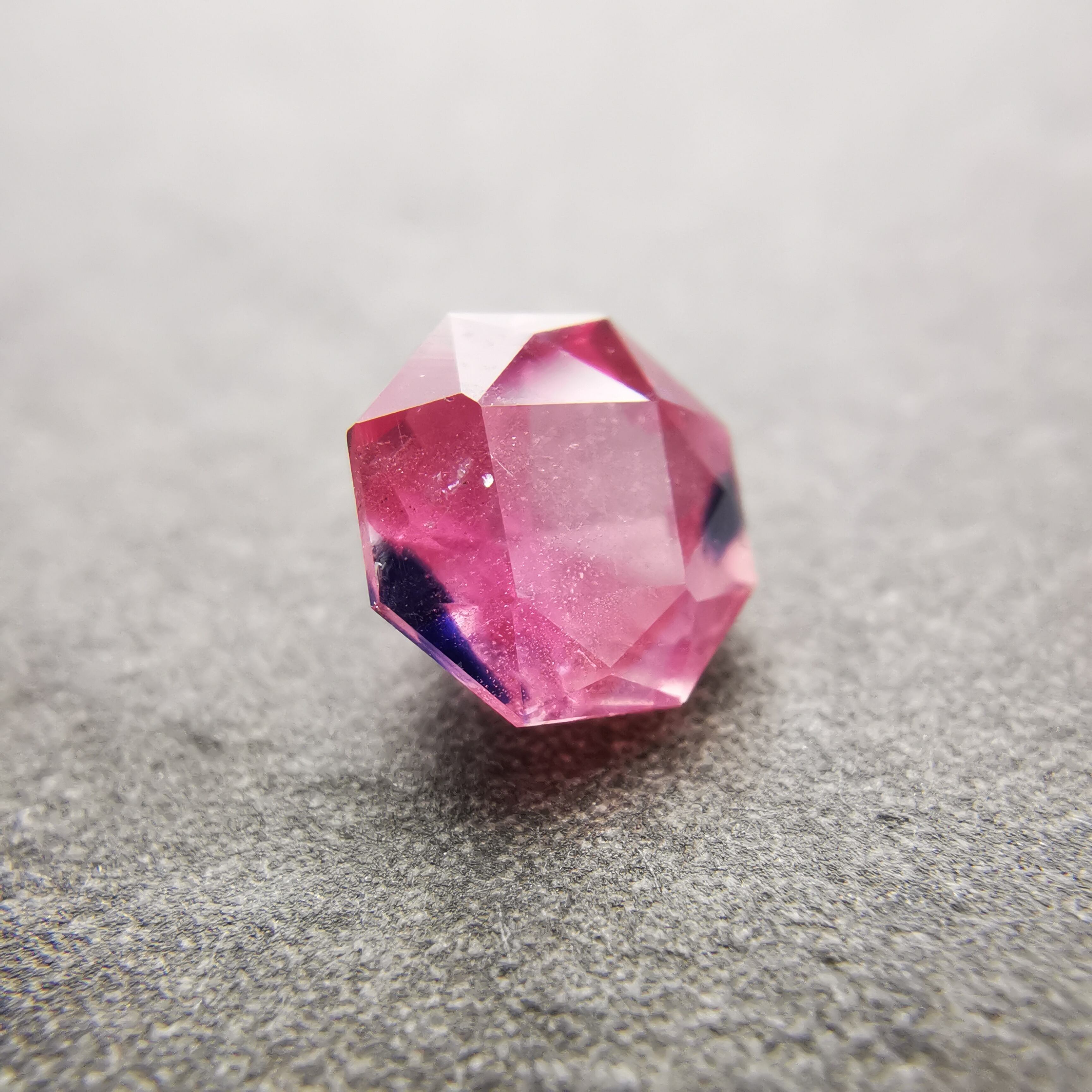 もやっとした石の中から、チェリーピンクがきらめき、ちょんと二か所入った濃いブルーが主張するサファイアです。
