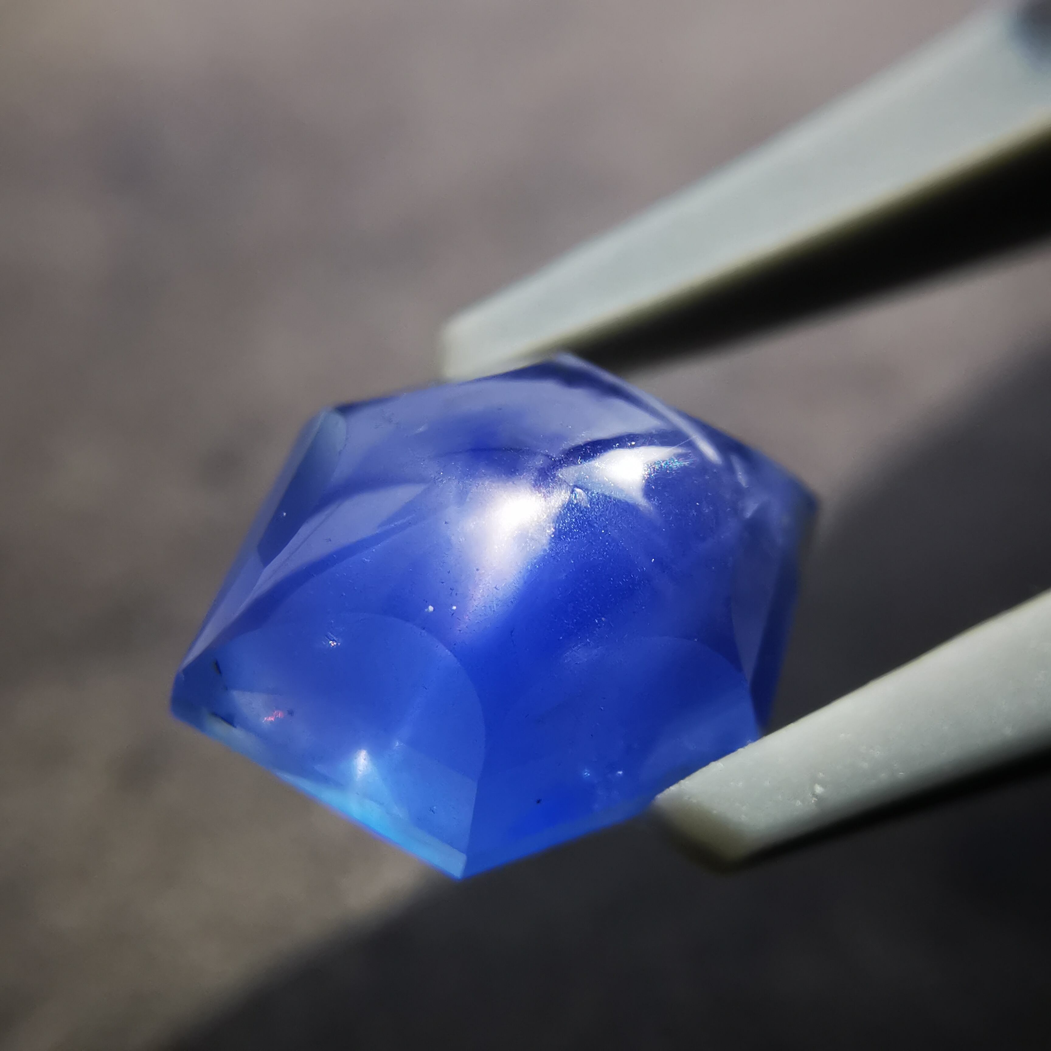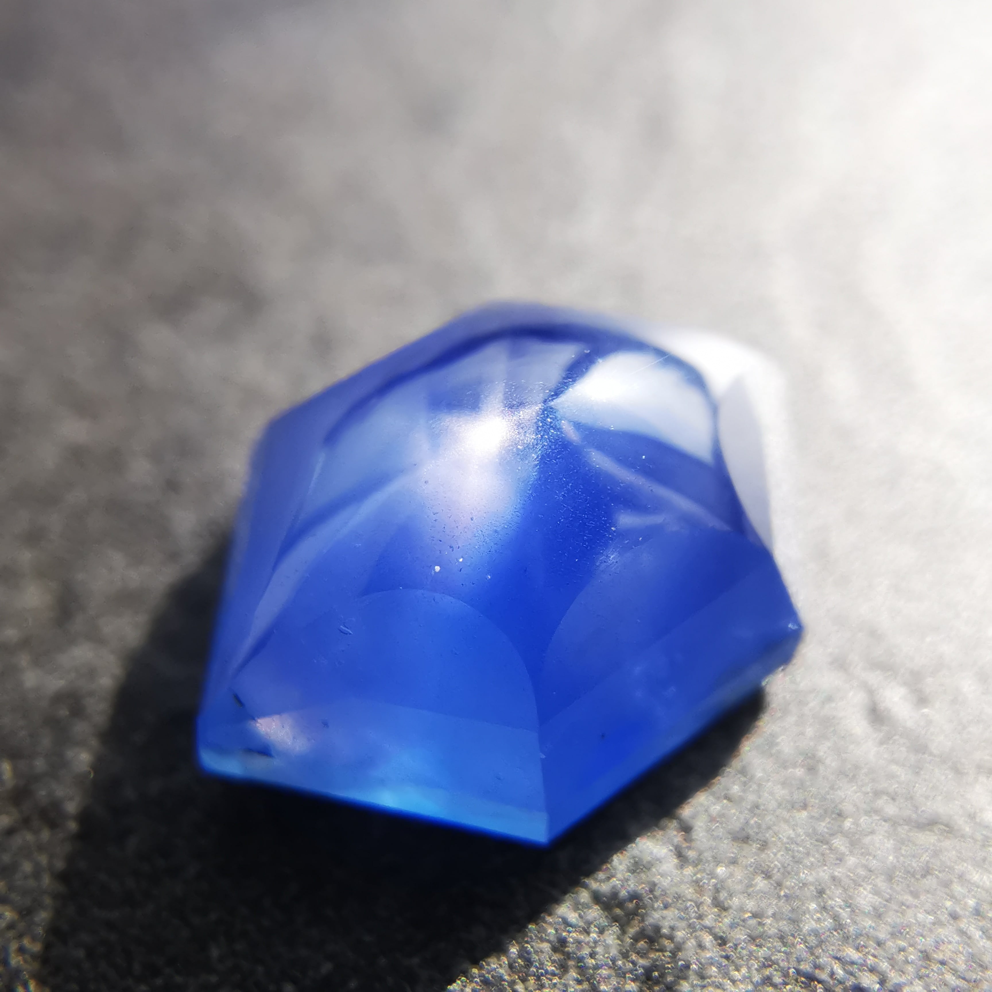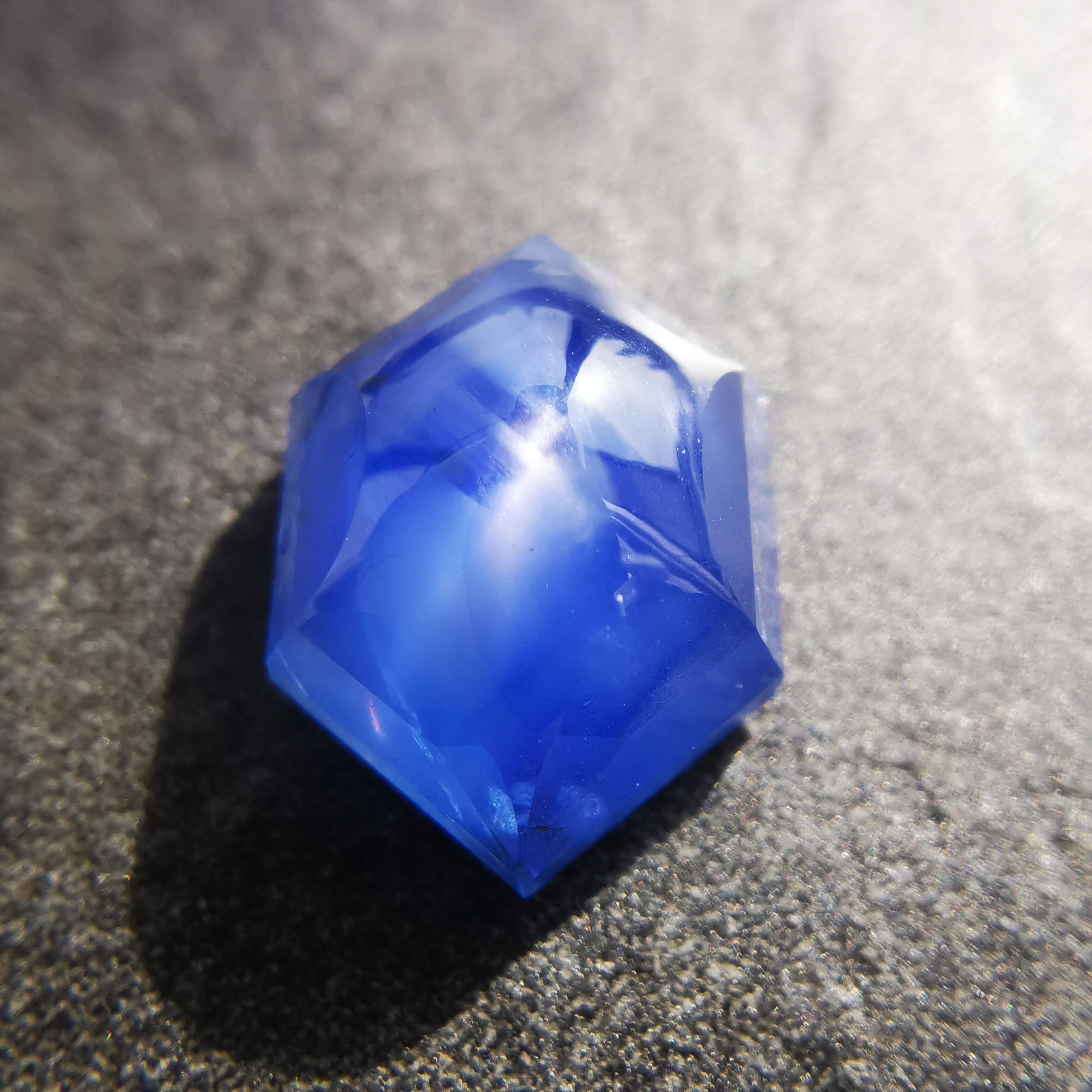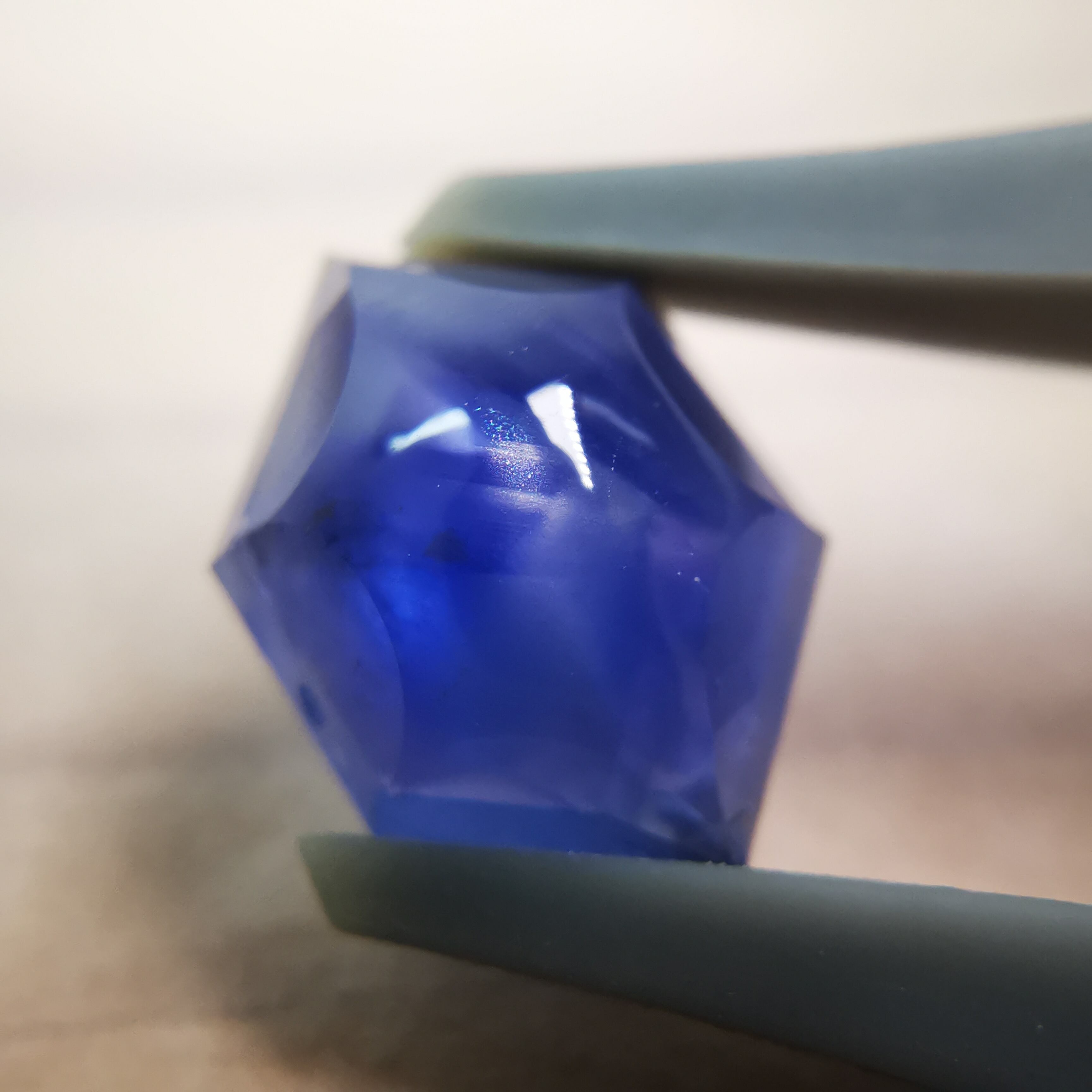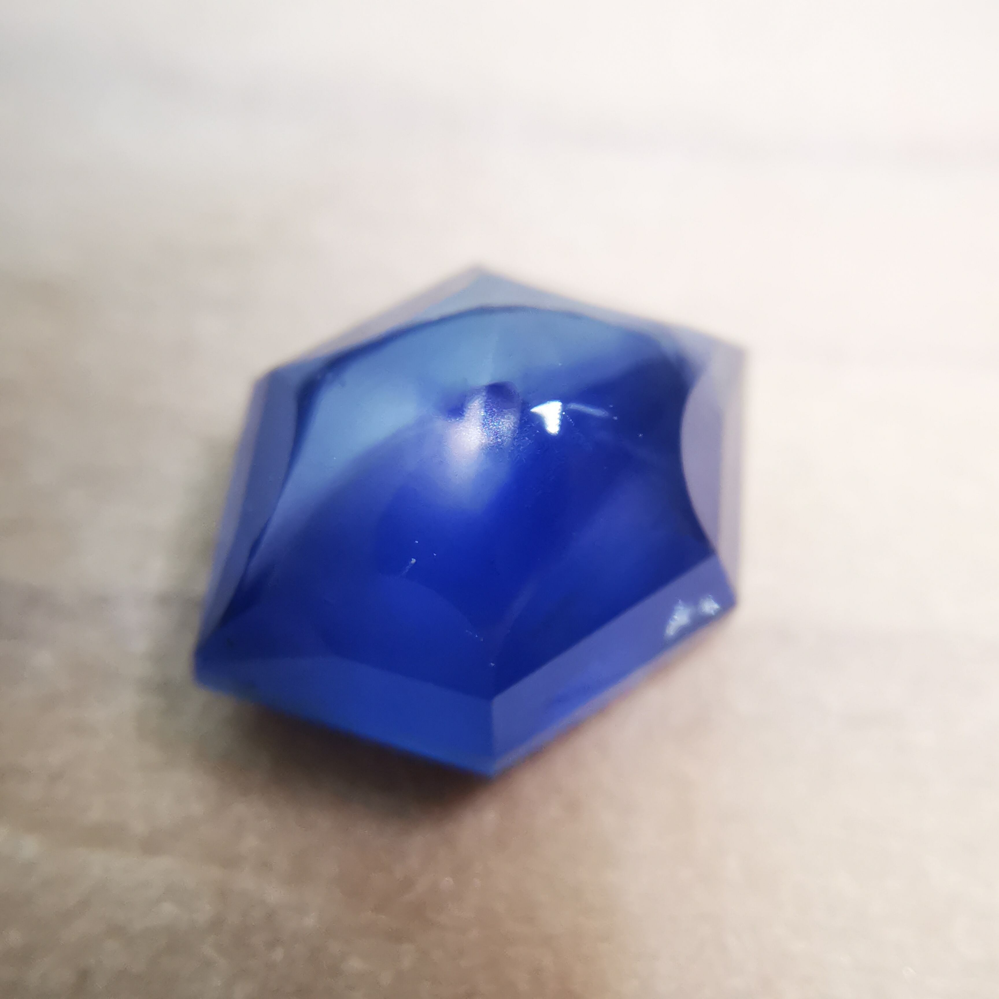深いブルーのスターサファイアを、スターを残したまま六角形にリカットしました。