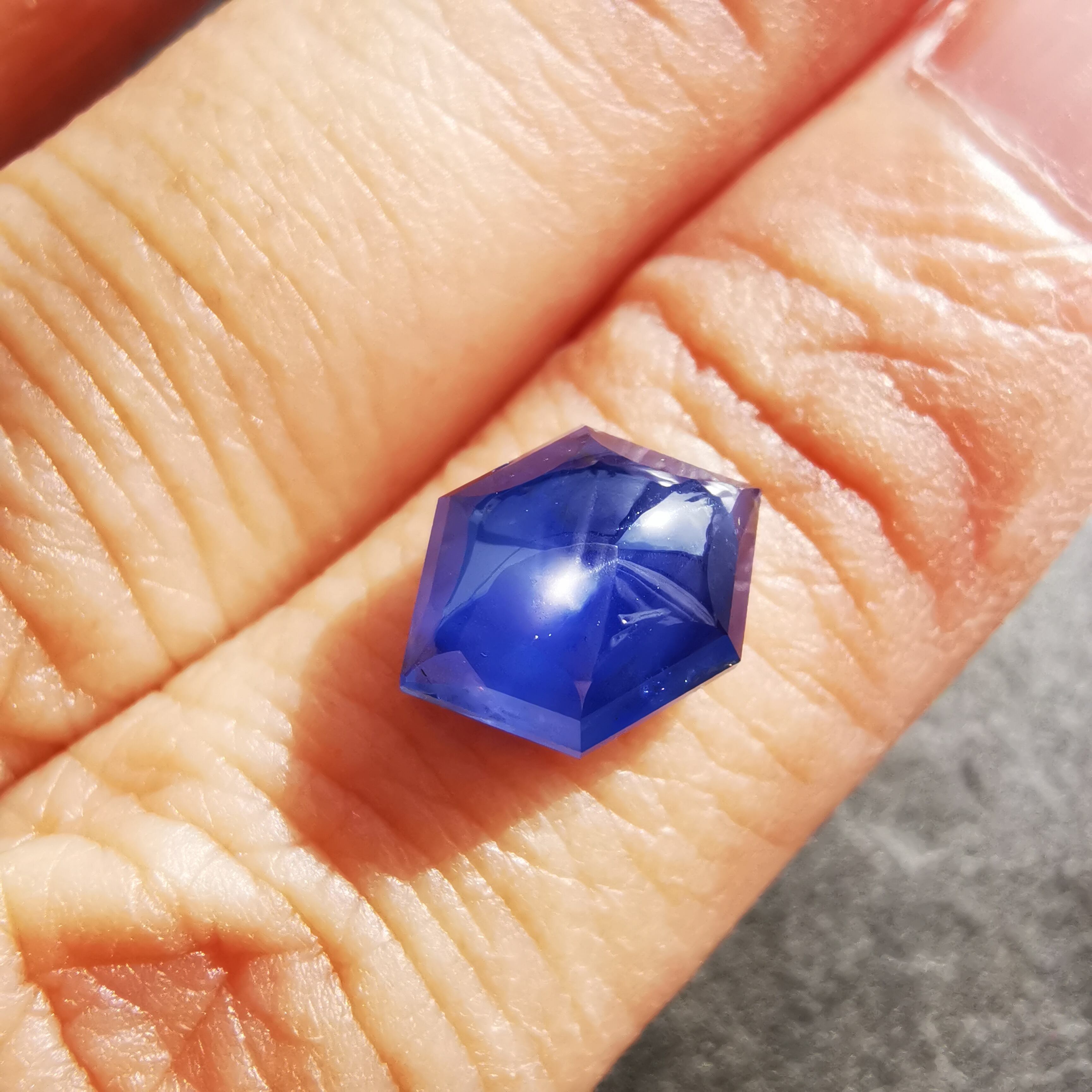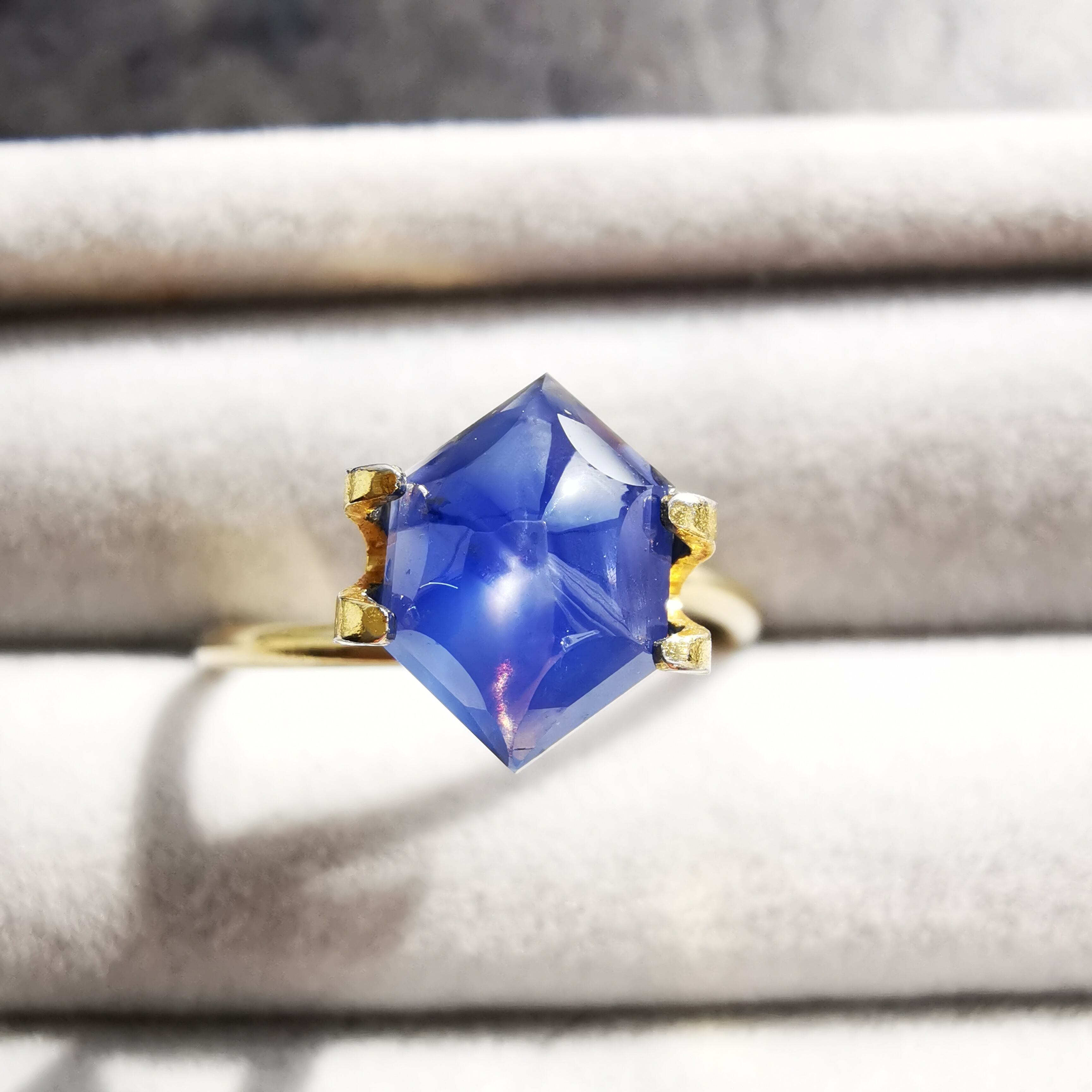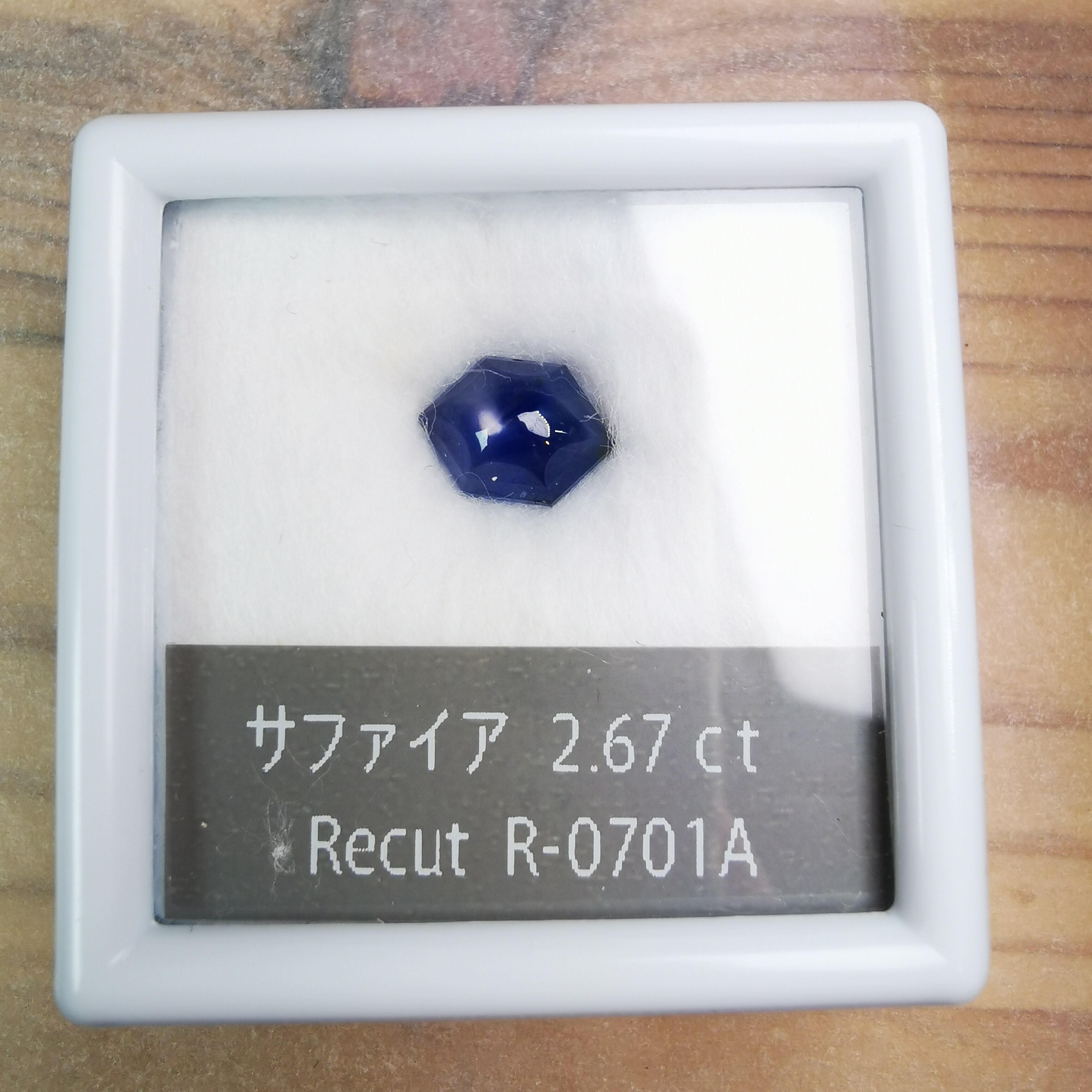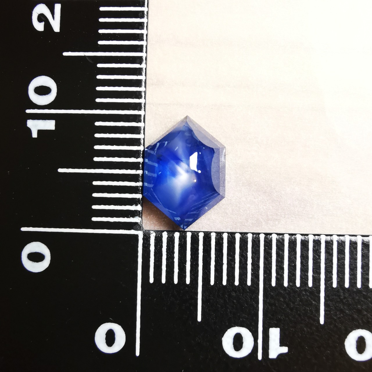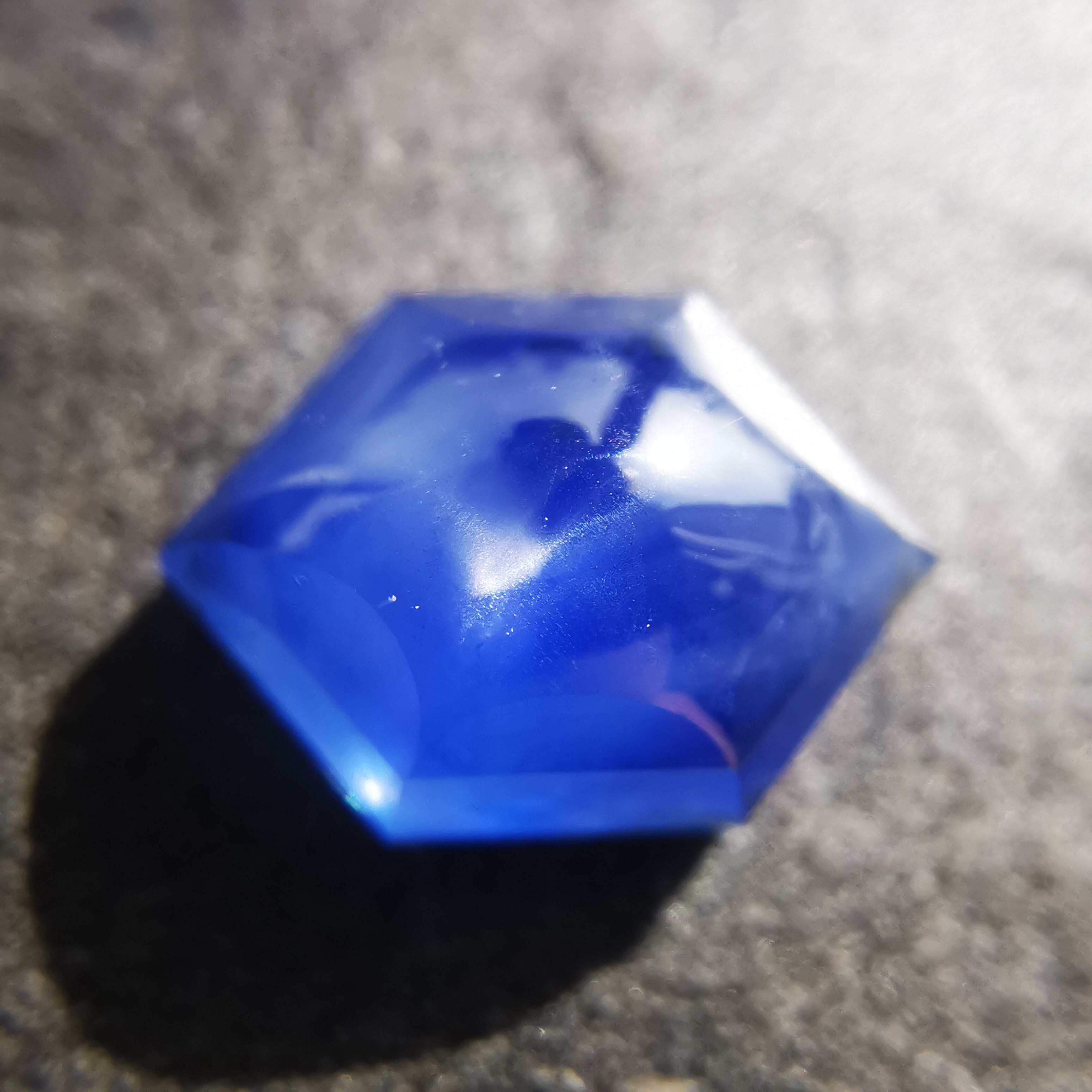 深いブルーのスターサファイアを、スターを残したまま六角形にリカットしました。