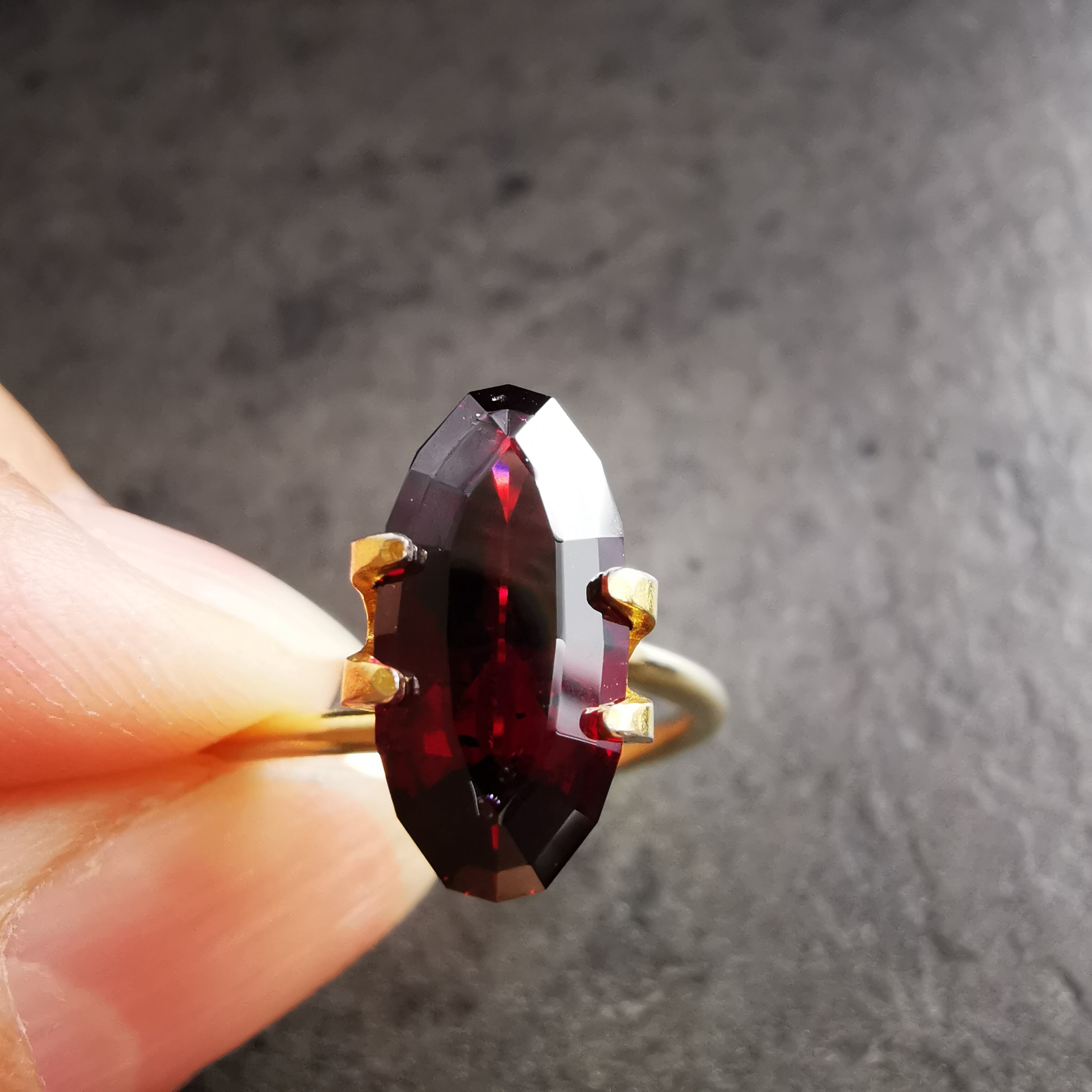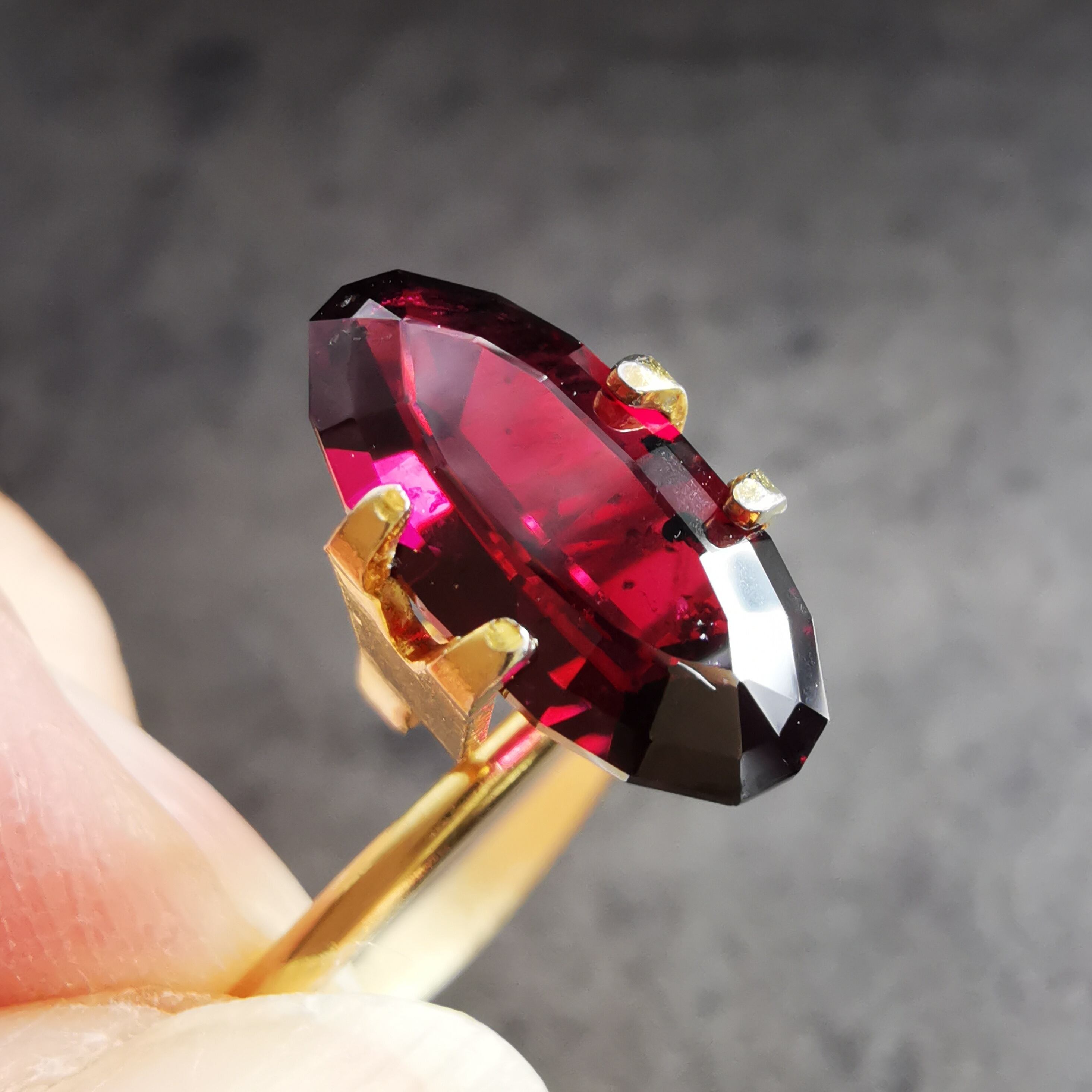黒に近い暗い石の中から真紅がきらめくガーネットです。
