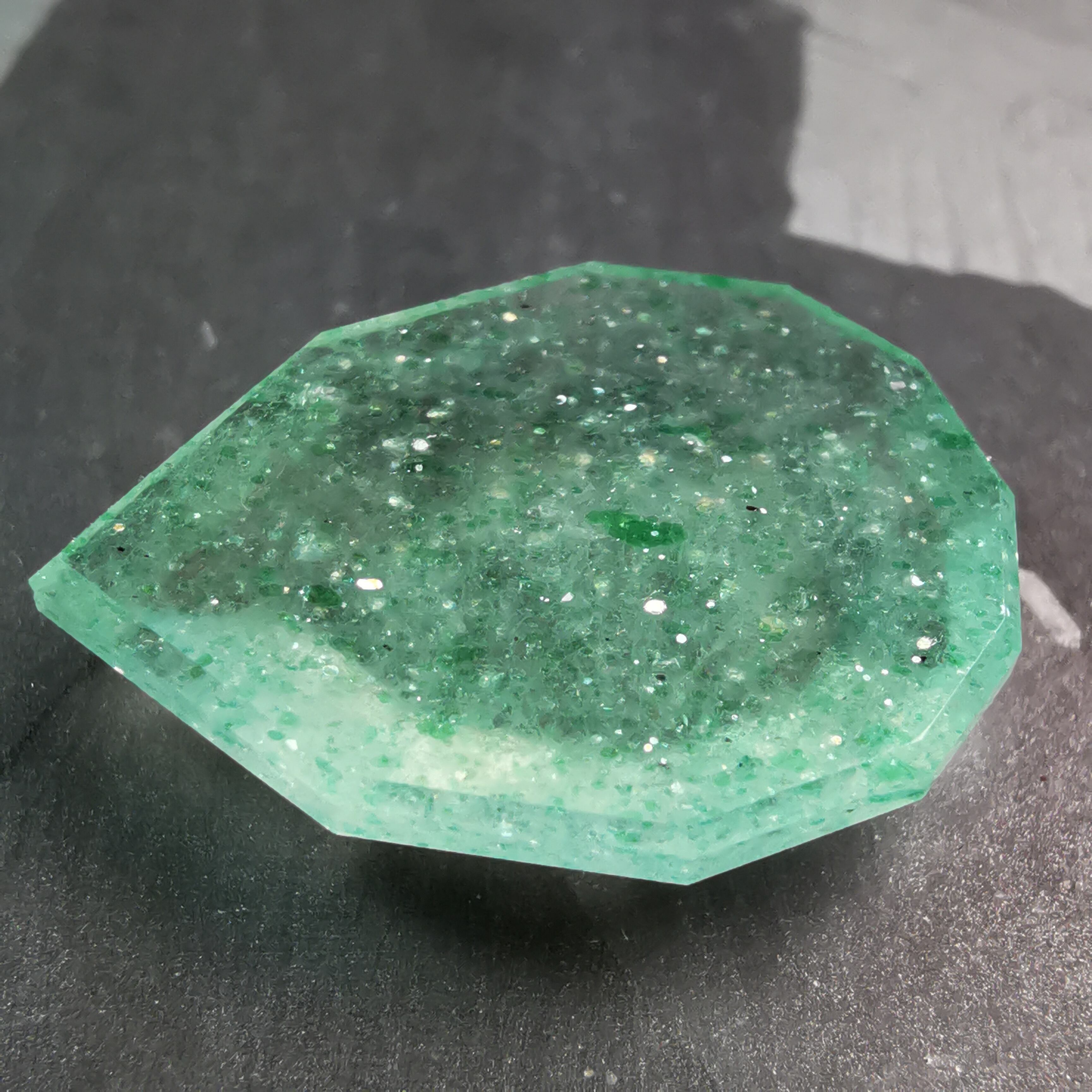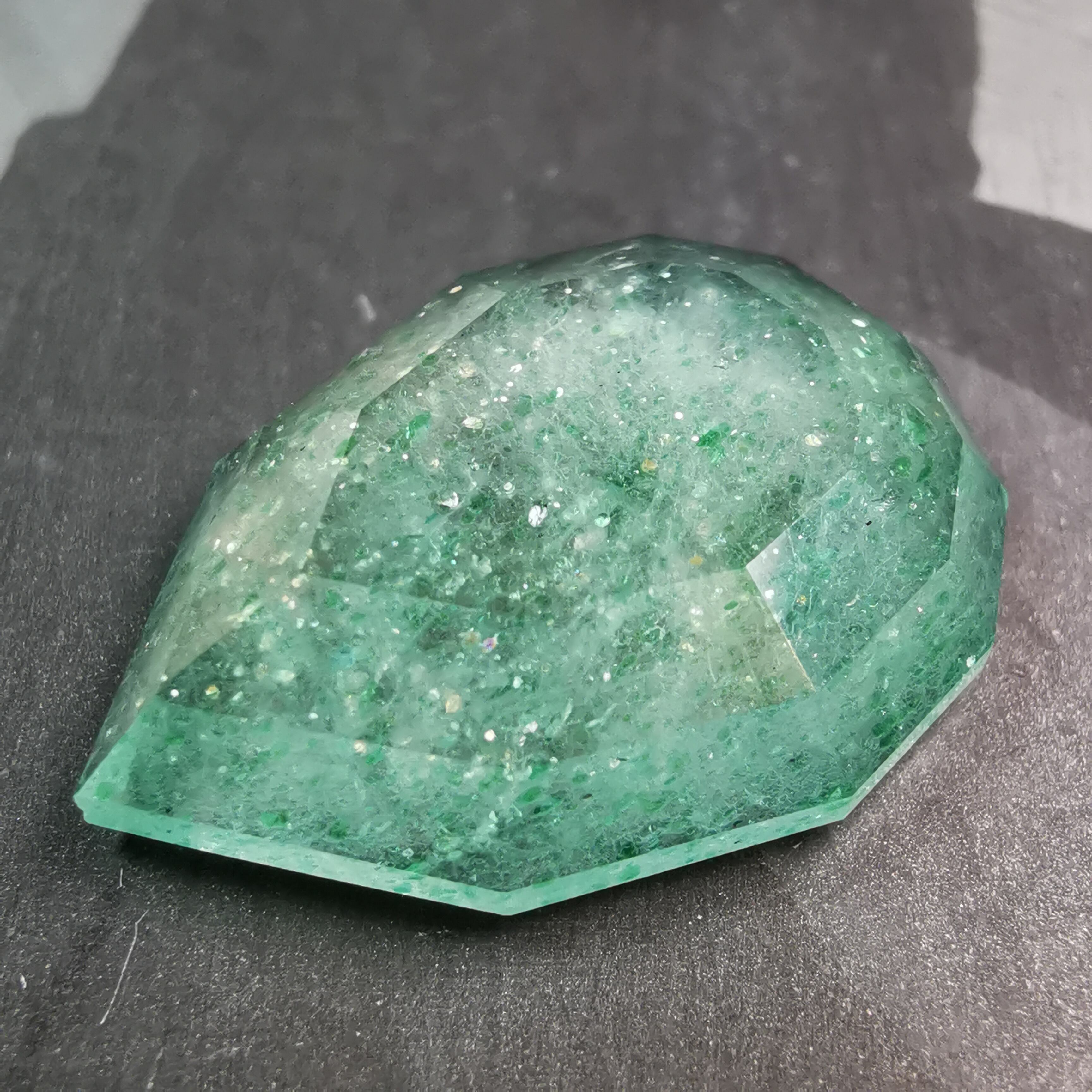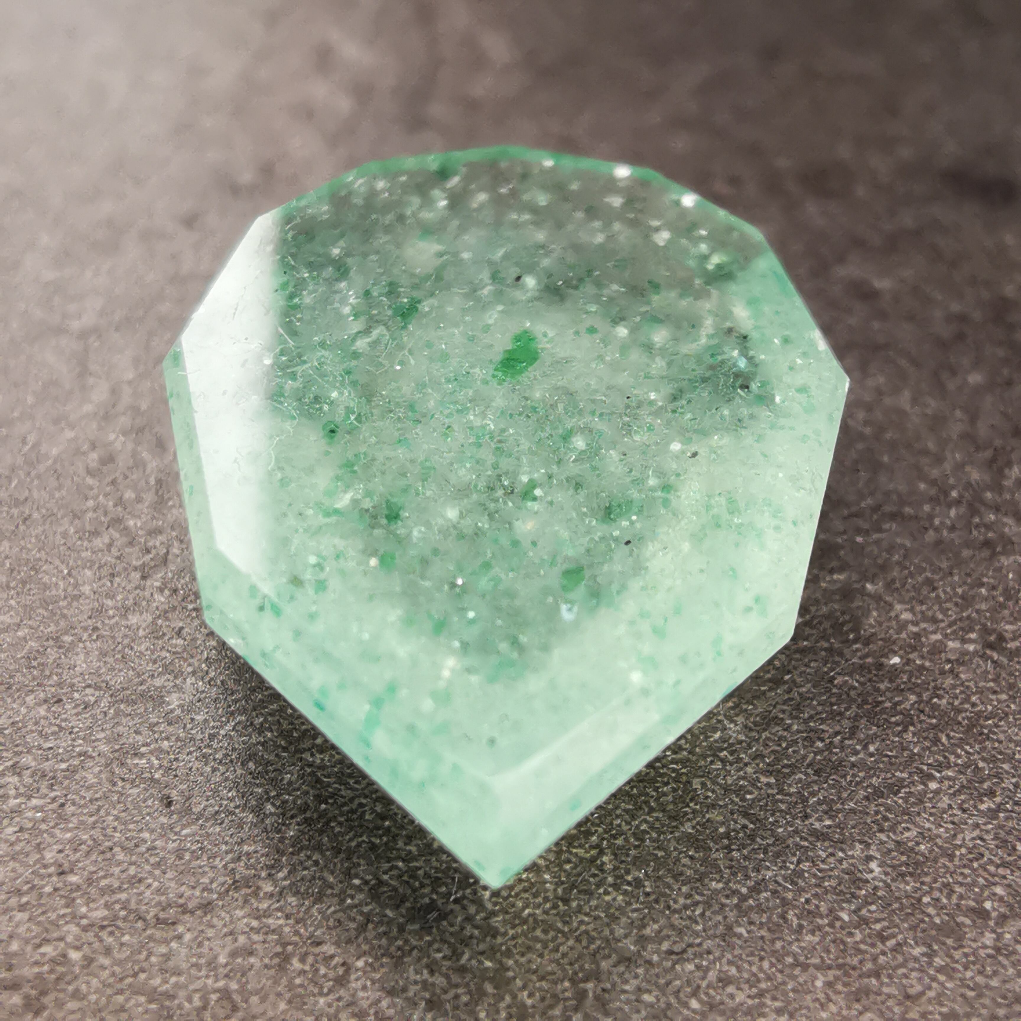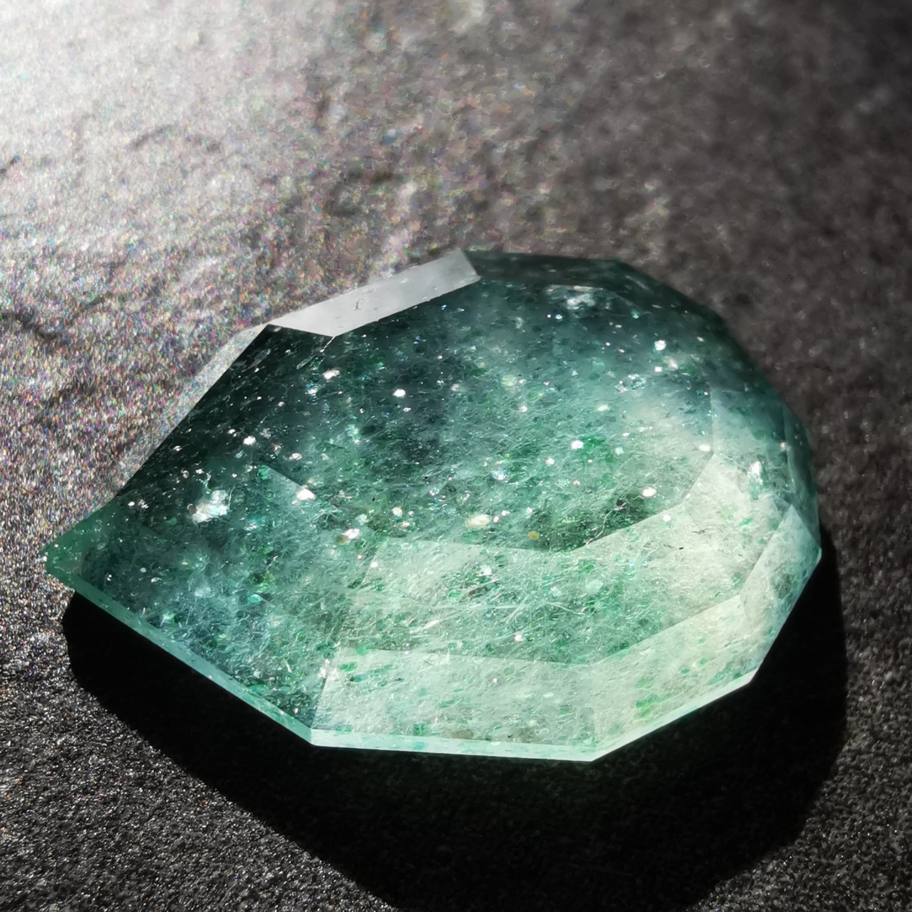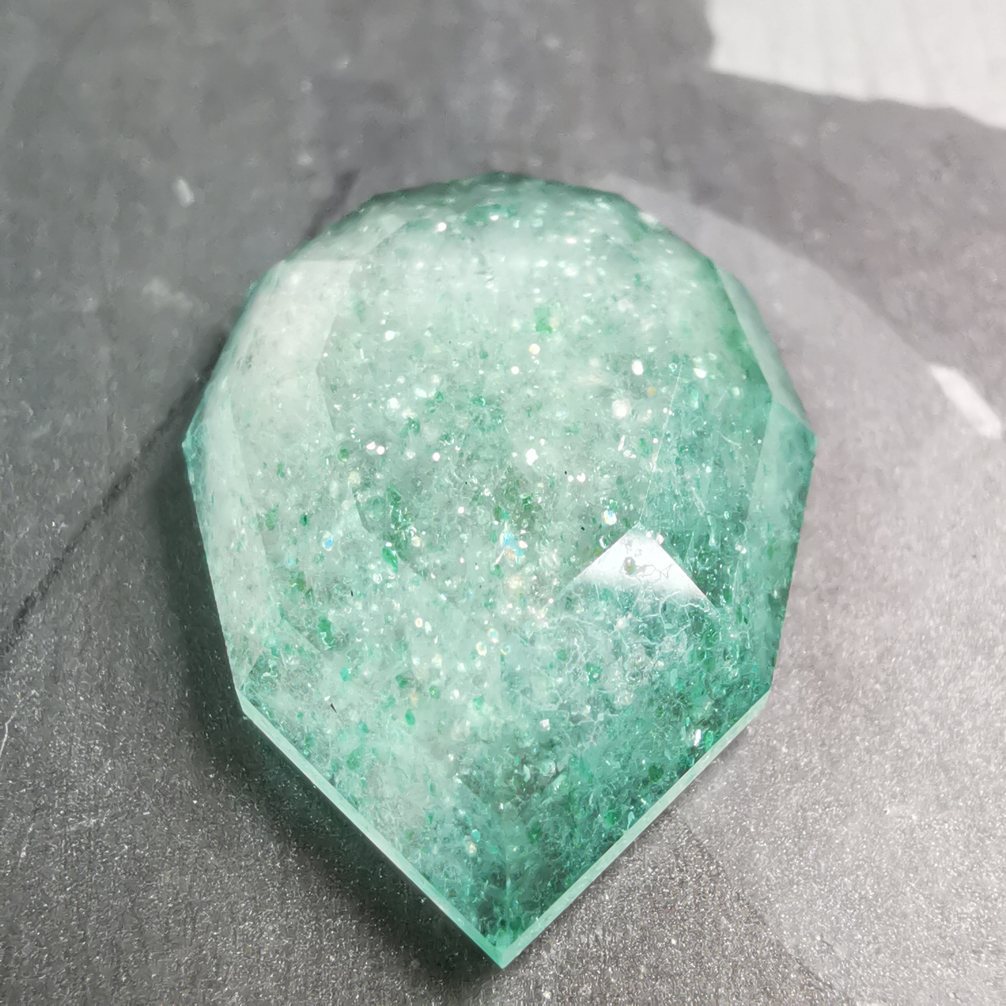 爽やかなグリーンの内包物に、陽に当たるとキラキラと光り、ラムネの炭酸ようにシュワシュワと弾けます。