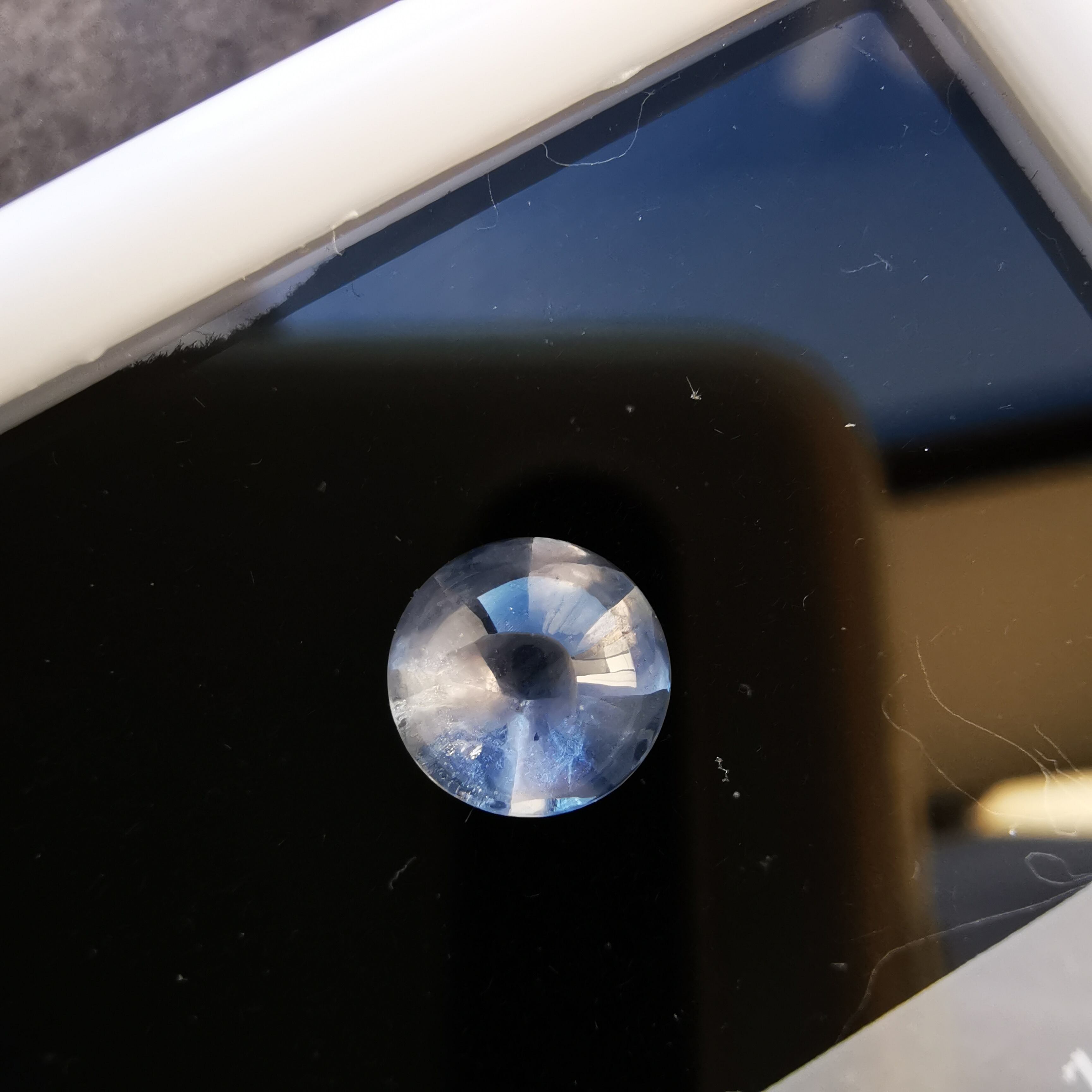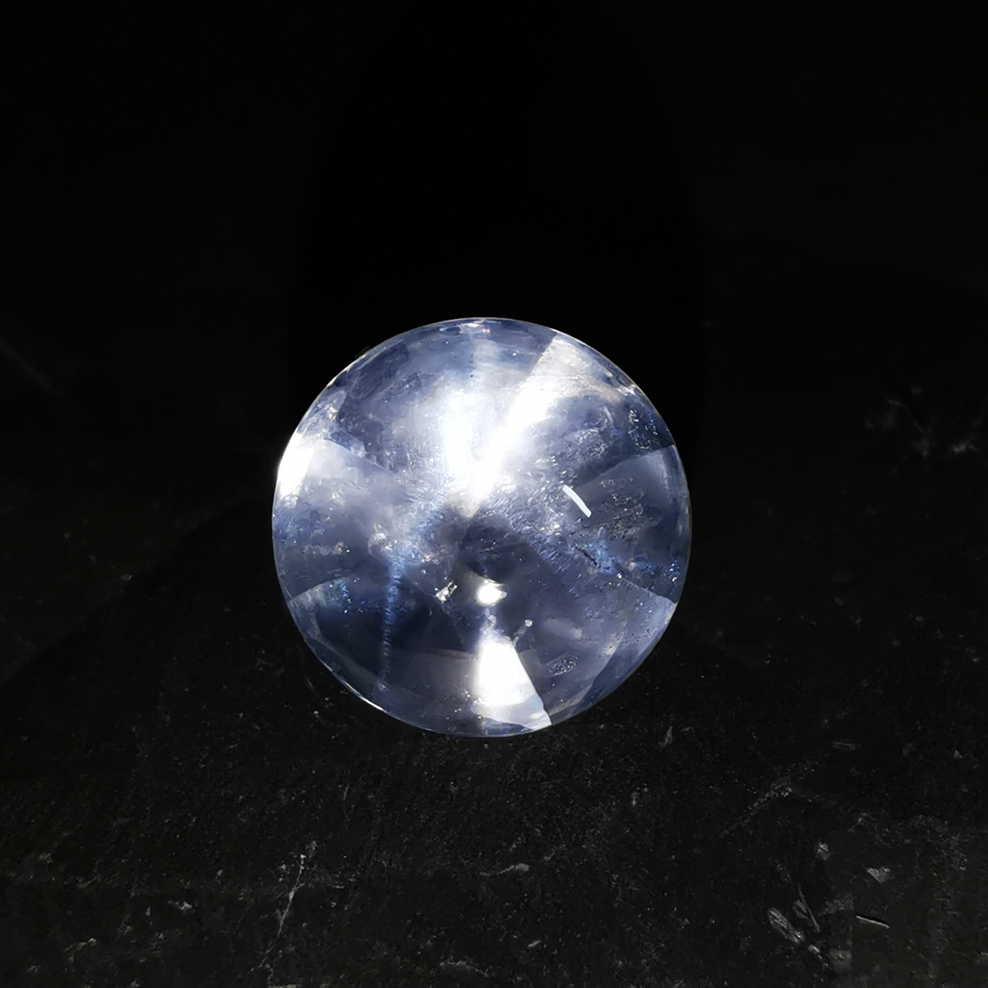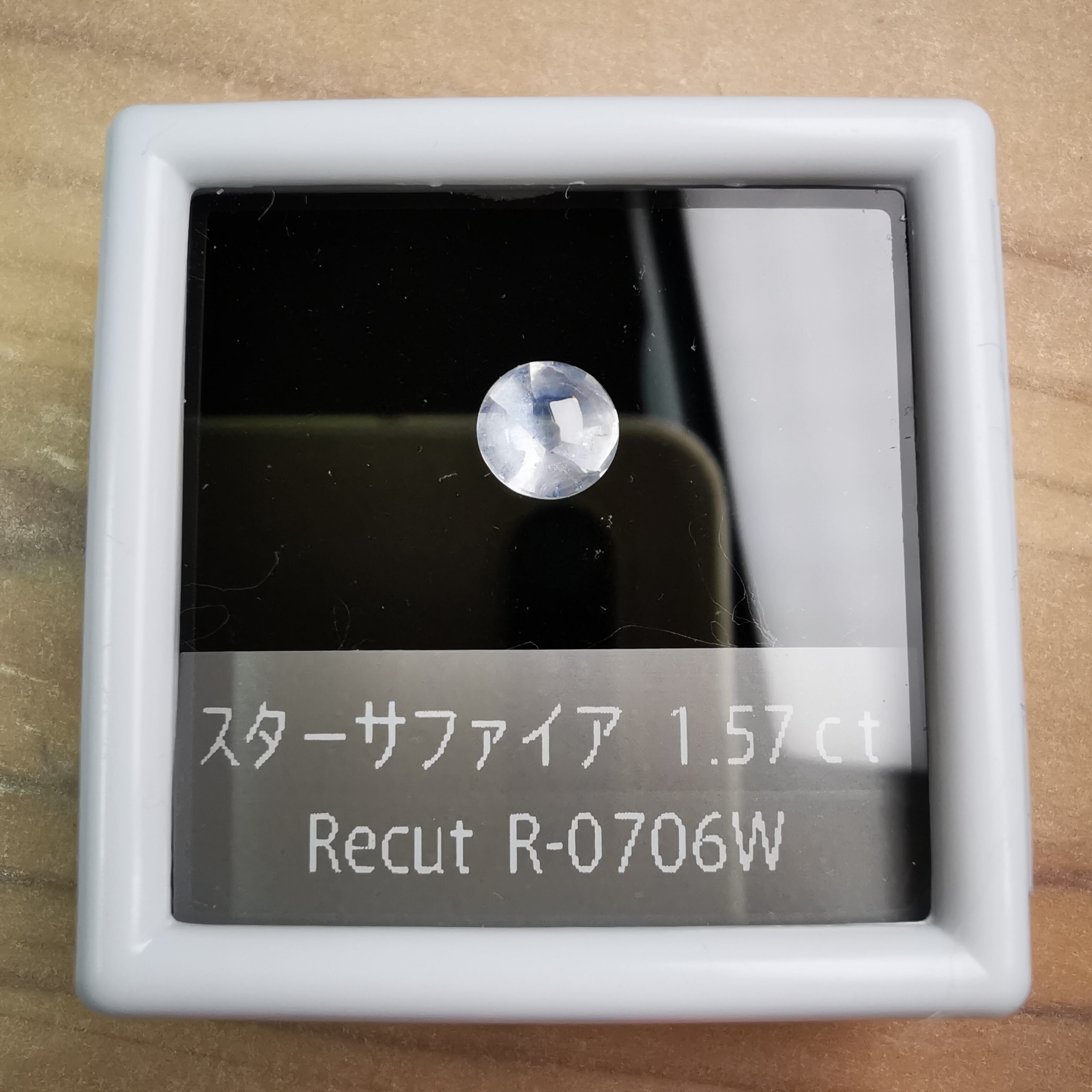 スターサファイアは通常カボションカットですが、透明度の高いスターサファイアならファセットカットのきらめきも同時に楽しめるのではないかと、バフトップにリカットしました。