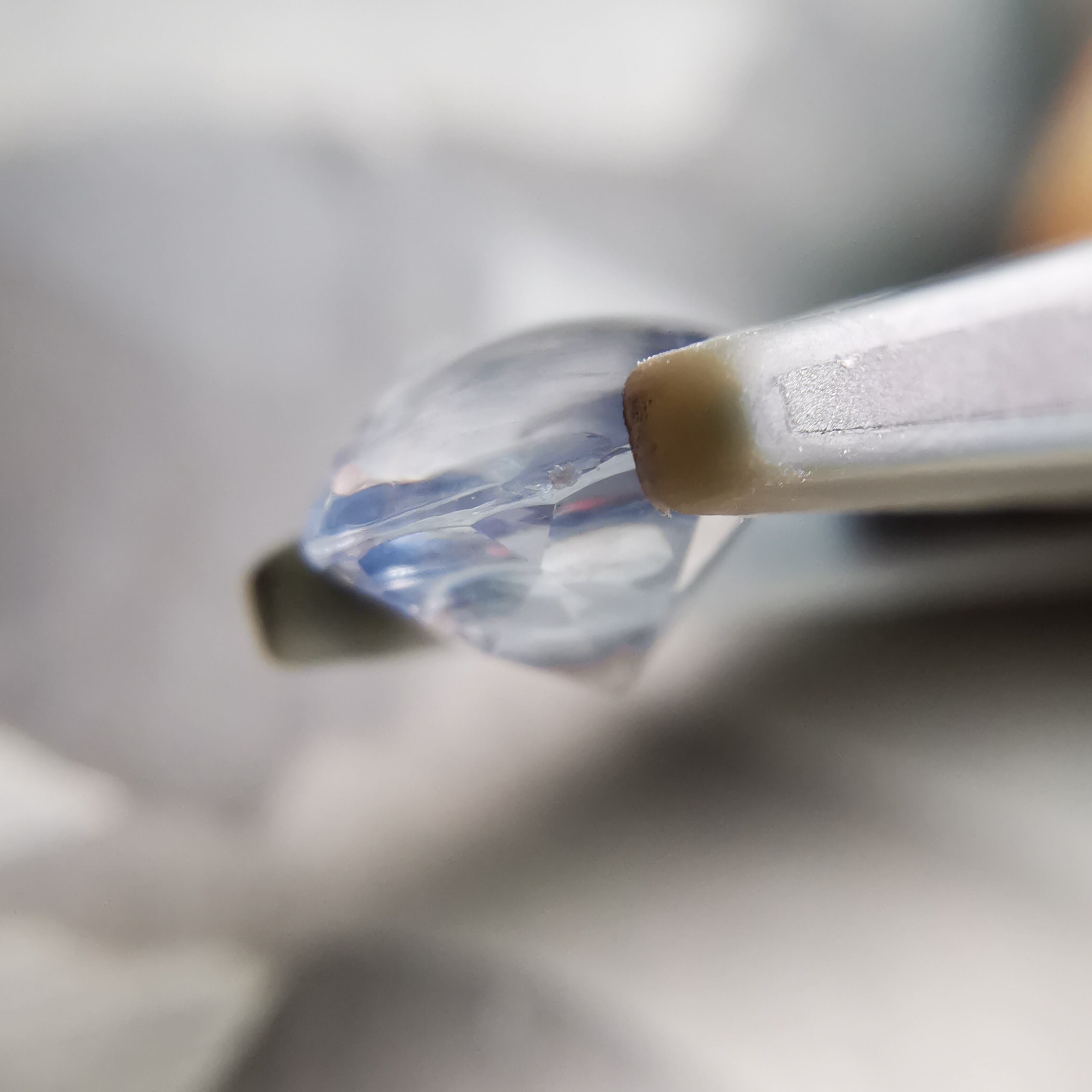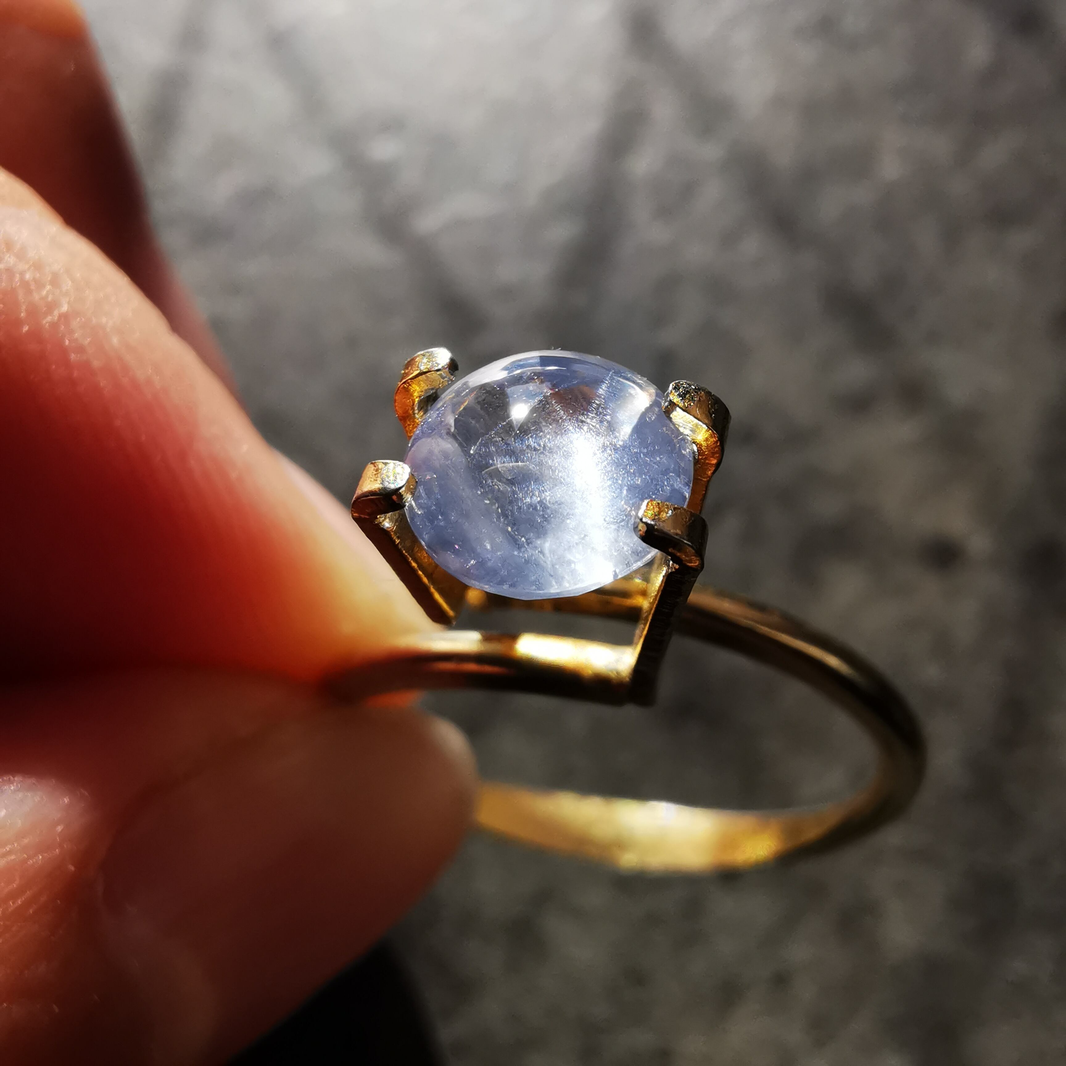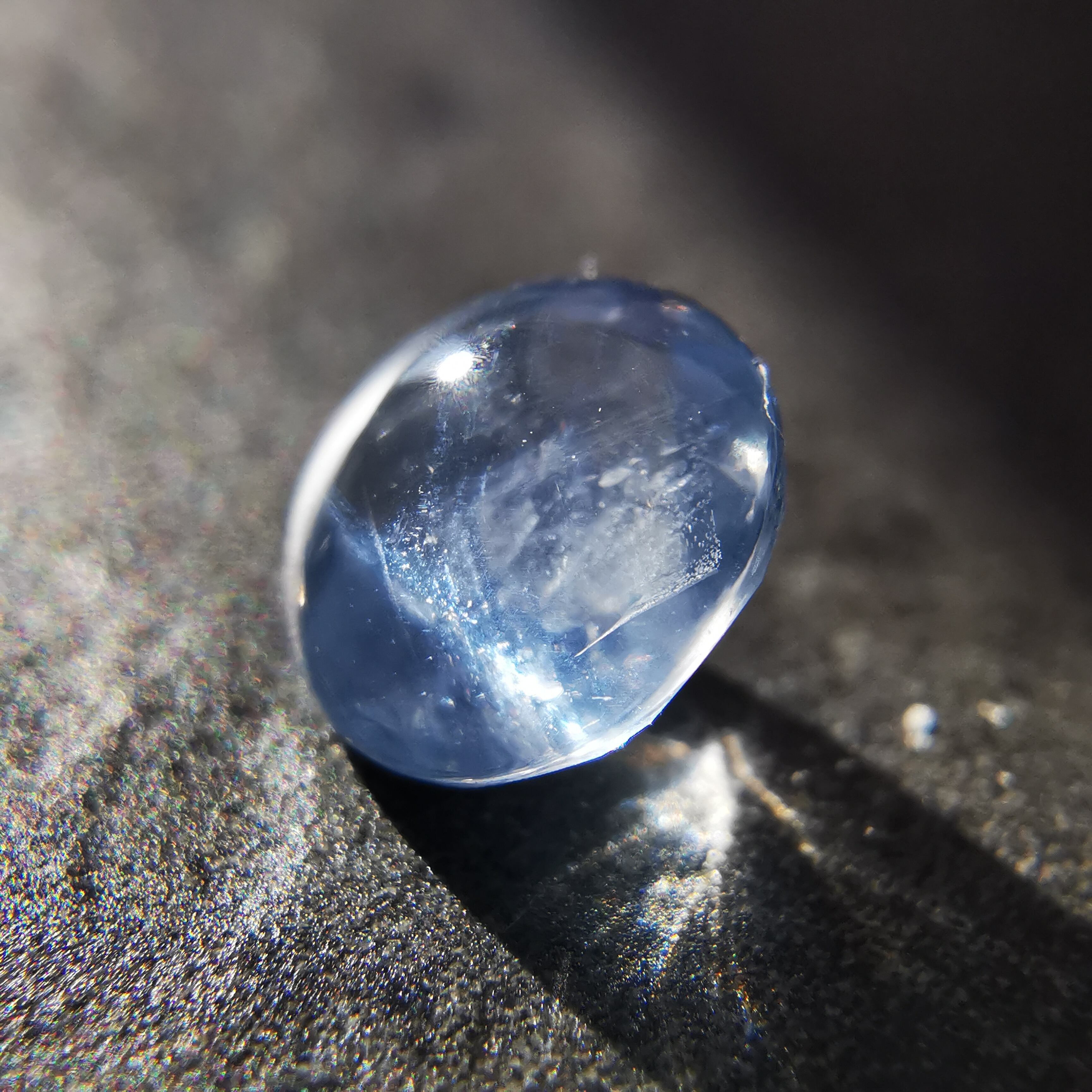 スターサファイアは通常カボションカットですが、透明度の高いスターサファイアならファセットカットのきらめきも同時に楽しめるのではないかと、バフトップにリカットしました。