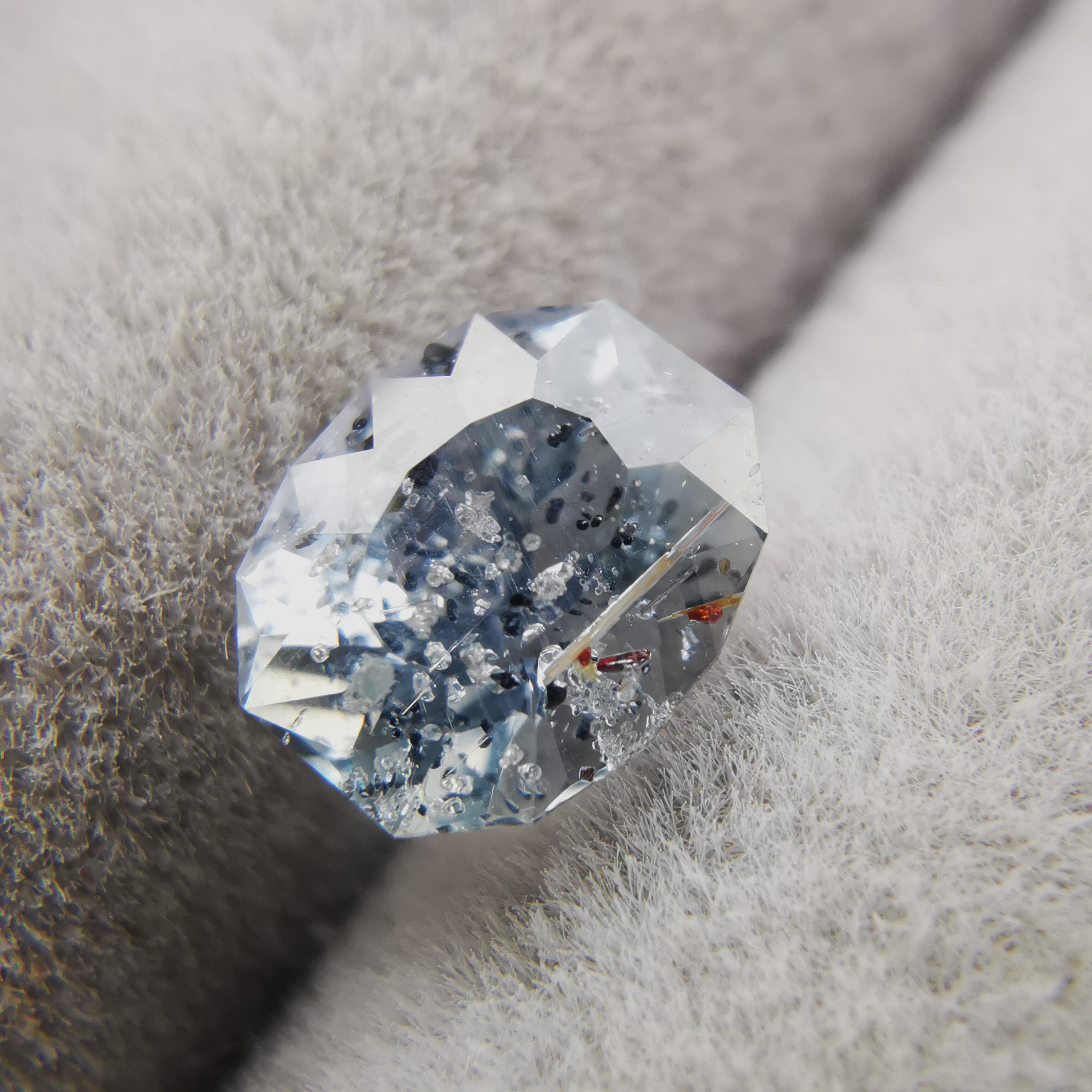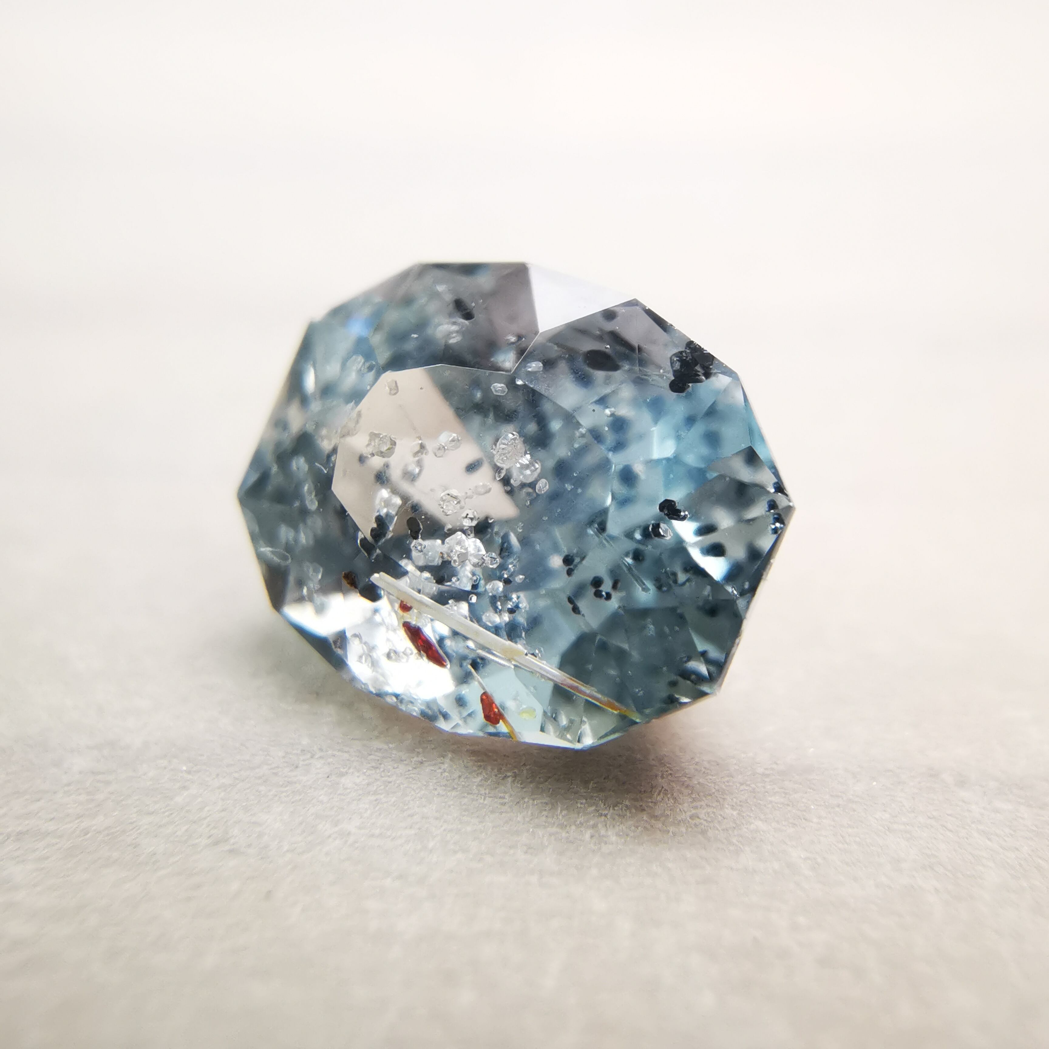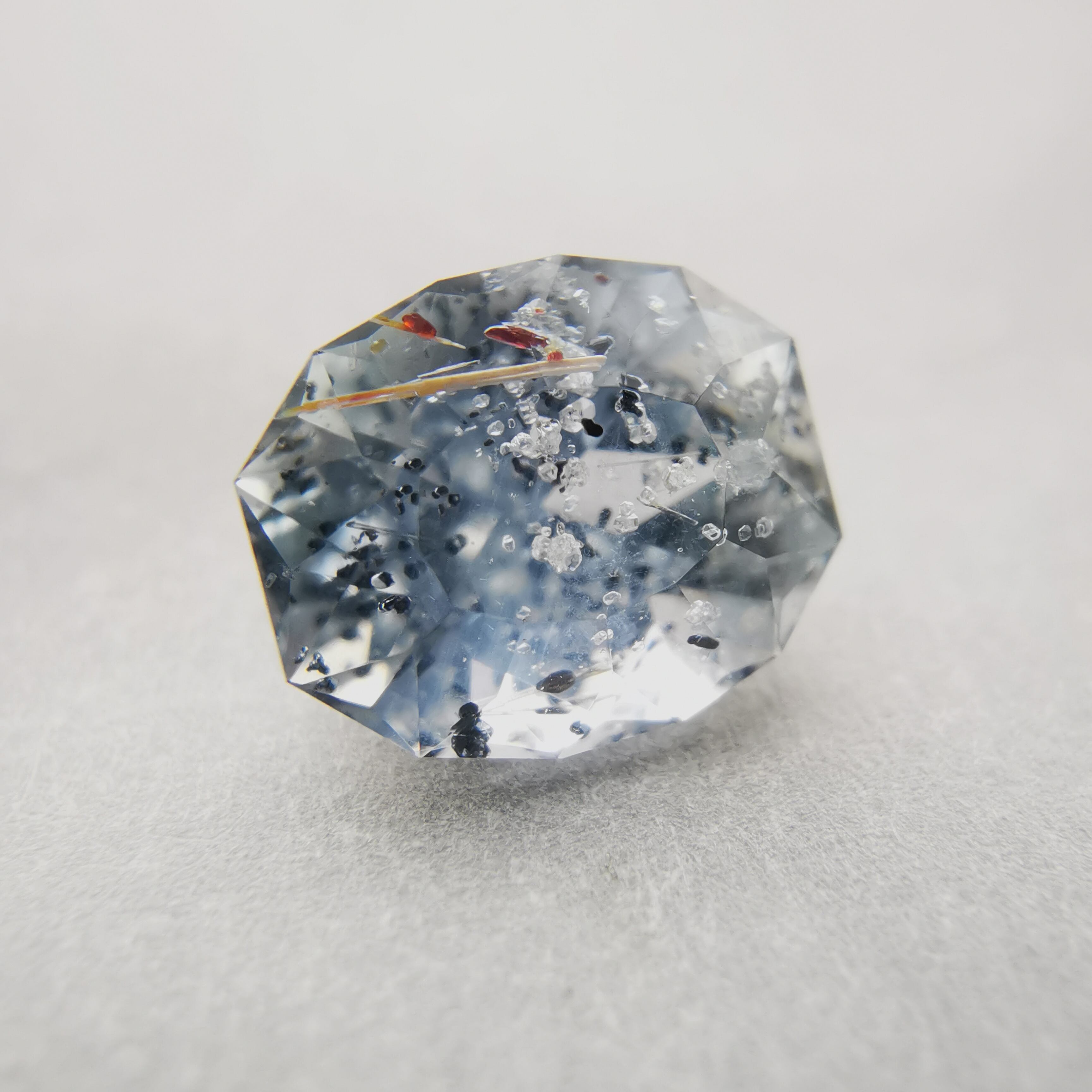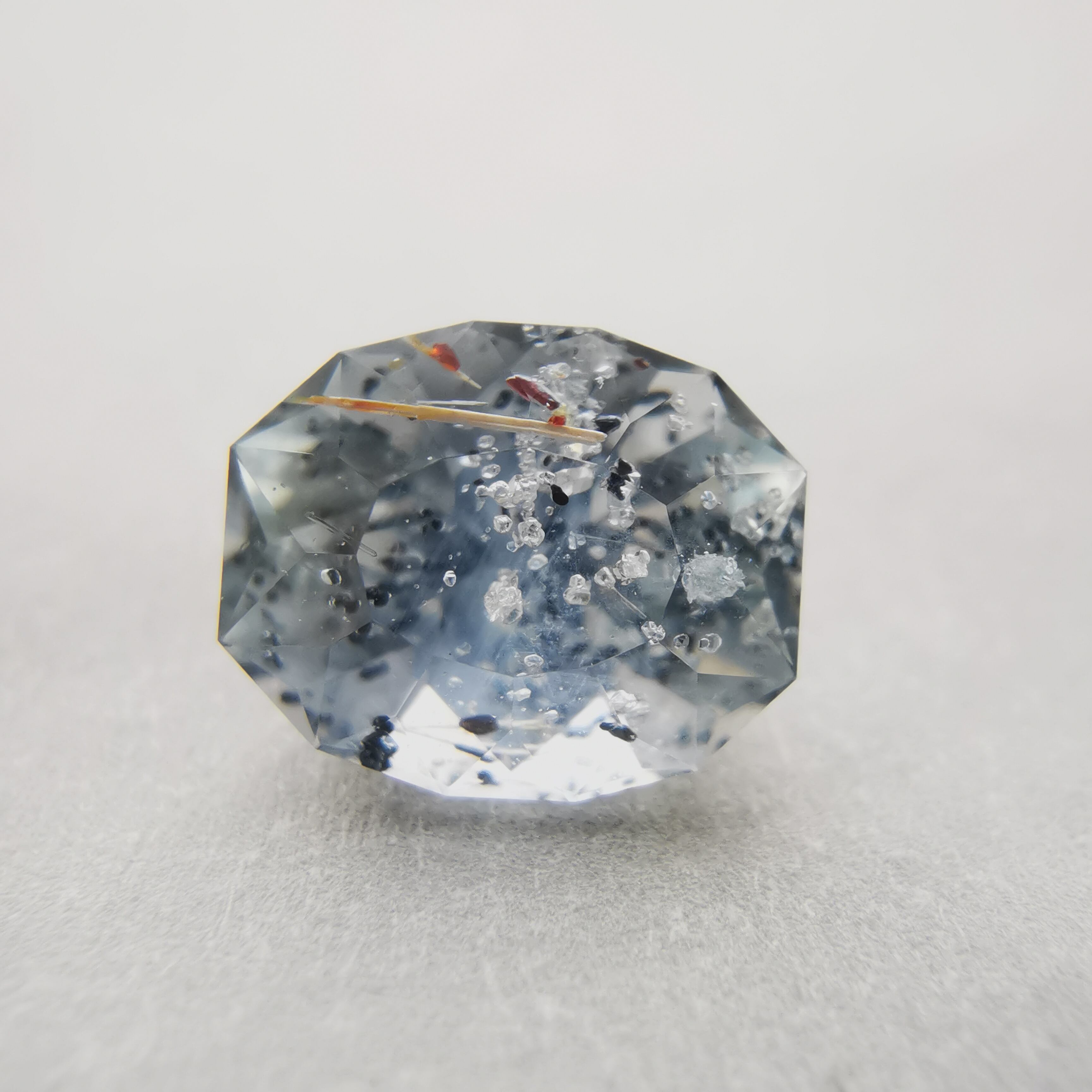 少しシルキーでカラーレスに近い、ごく淡い緑みブルーのサファイアに、様々なインクルージョンが入っています。
