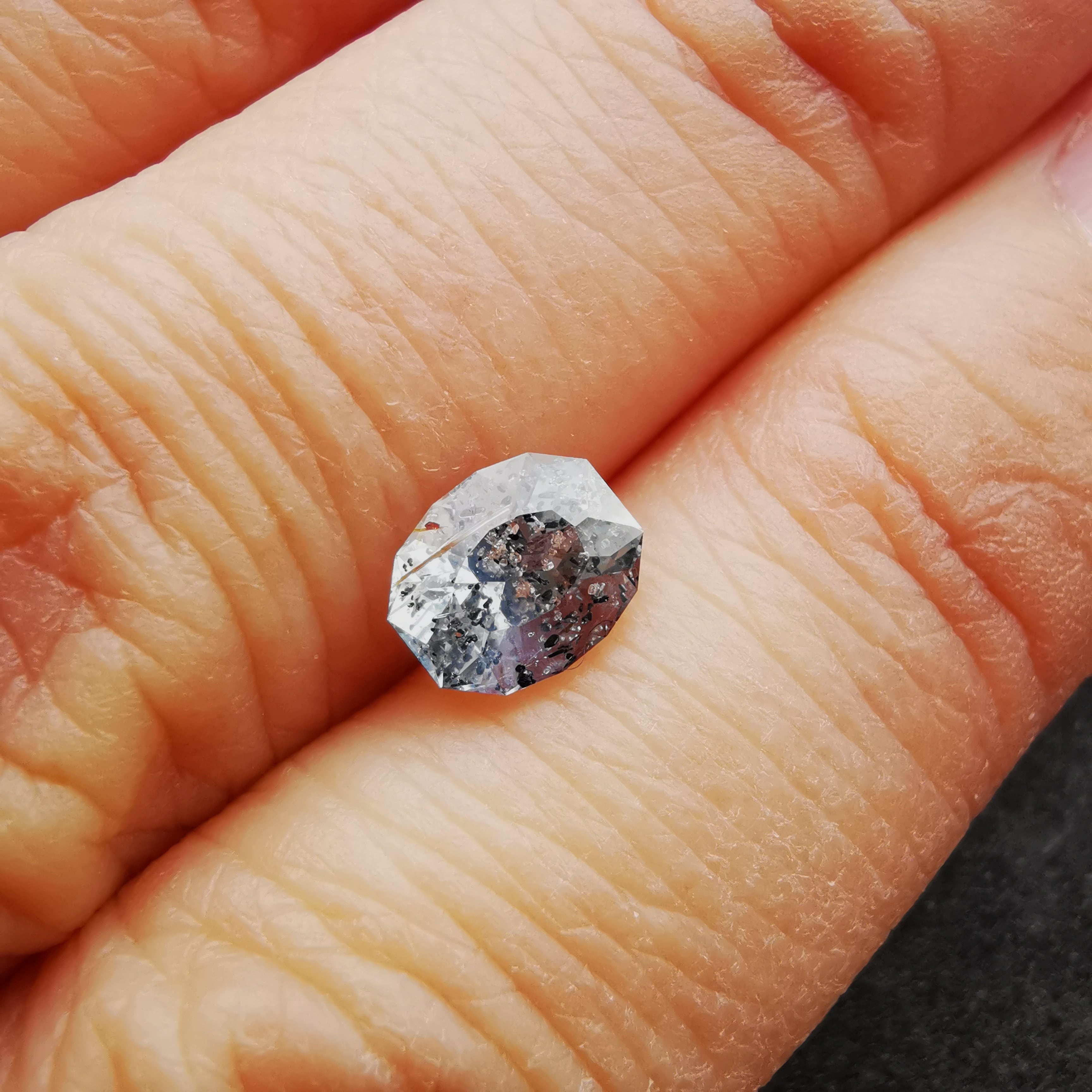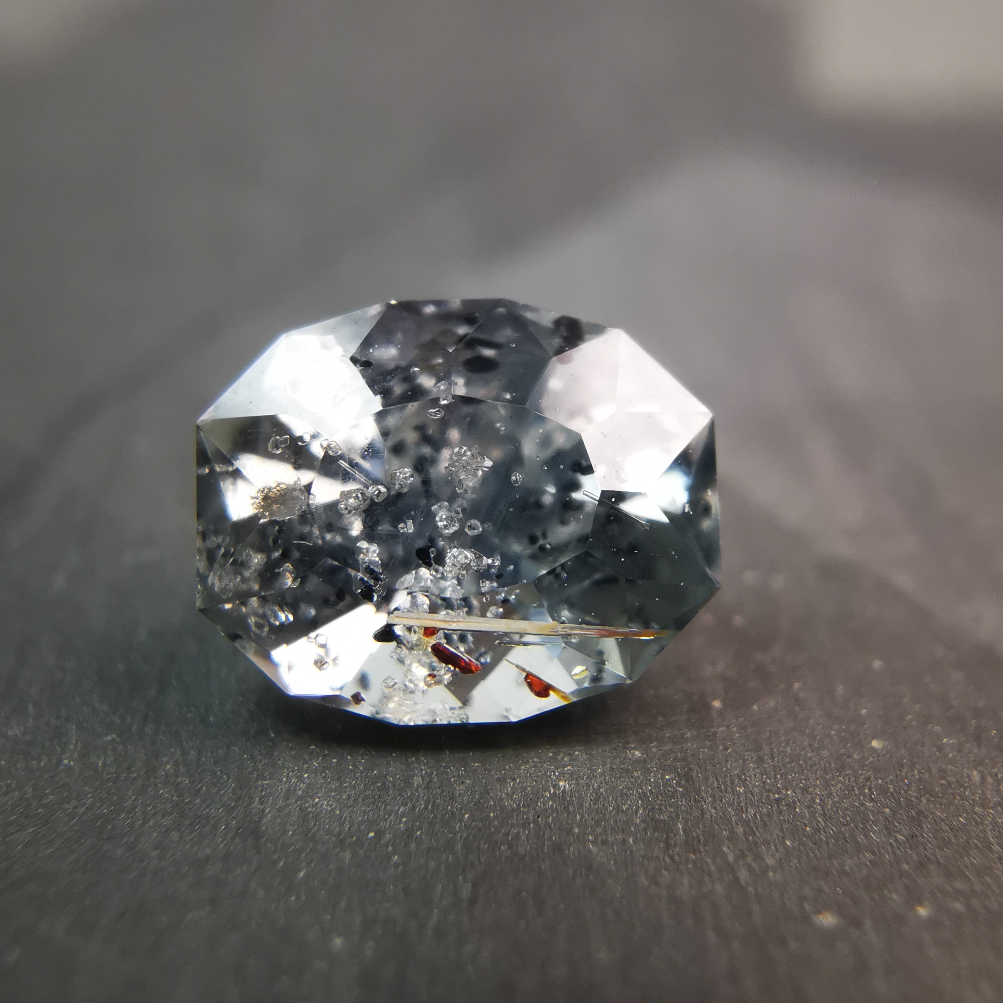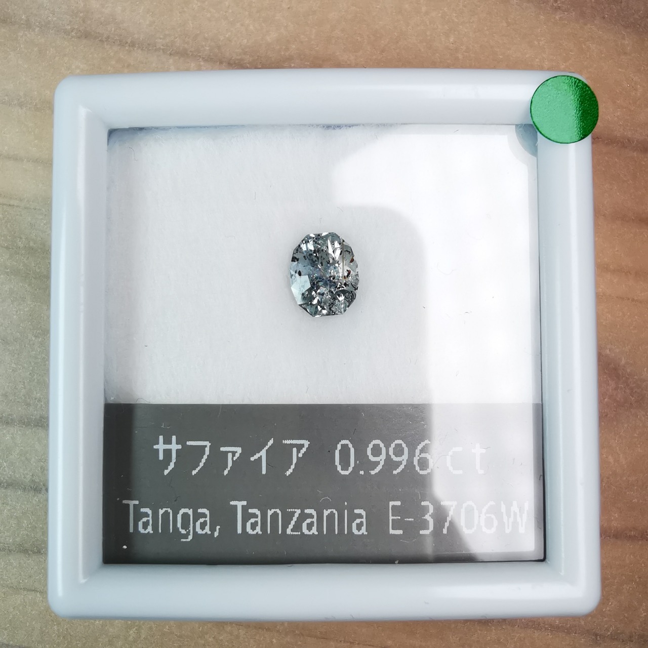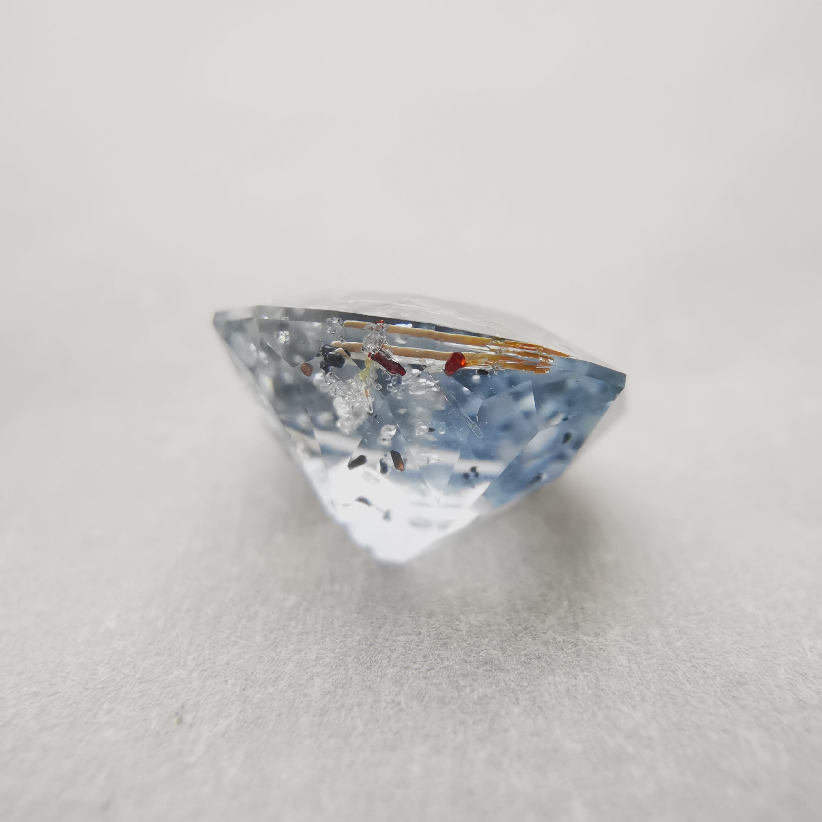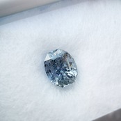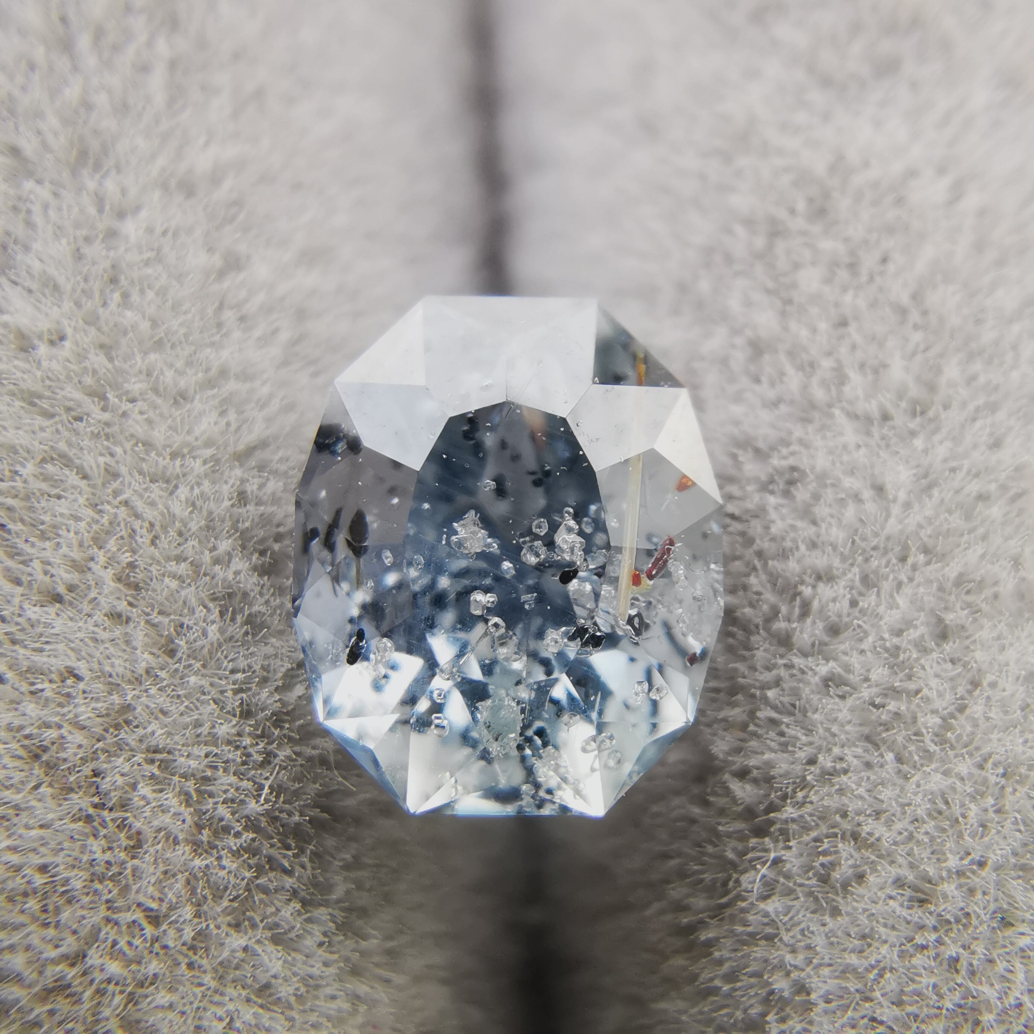 少しシルキーでカラーレスに近い、ごく淡い緑みブルーのサファイアに、様々なインクルージョンが入っています。