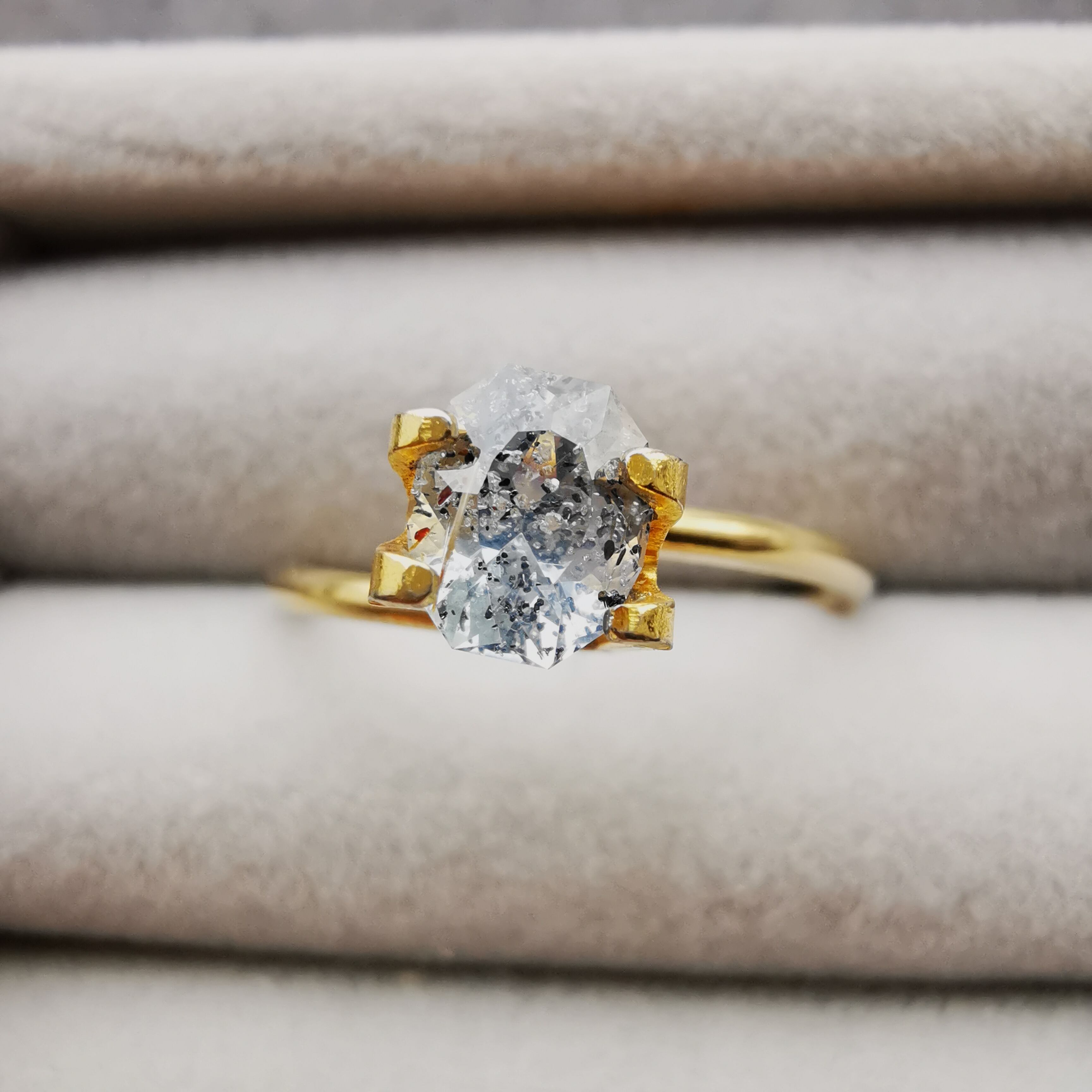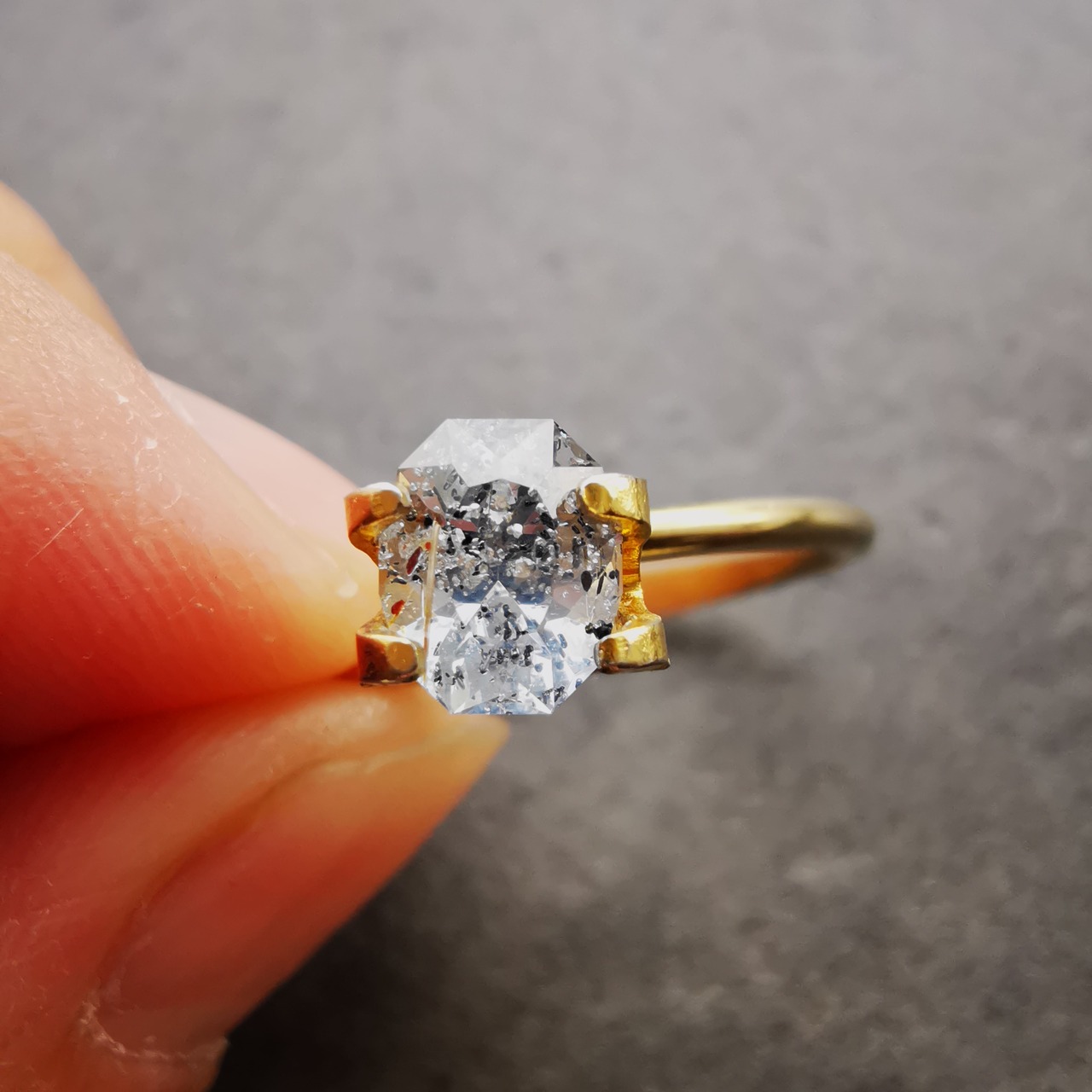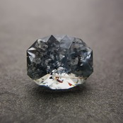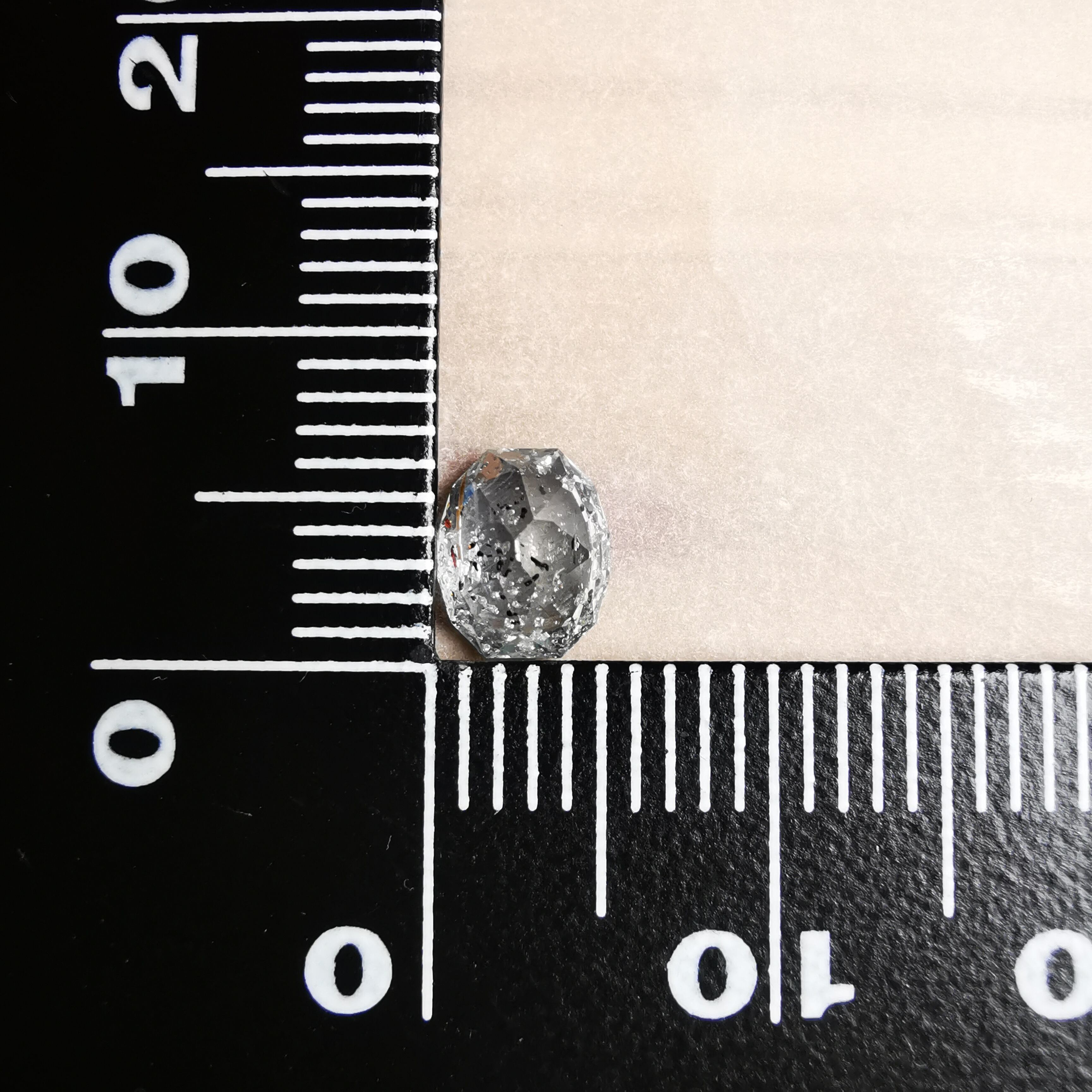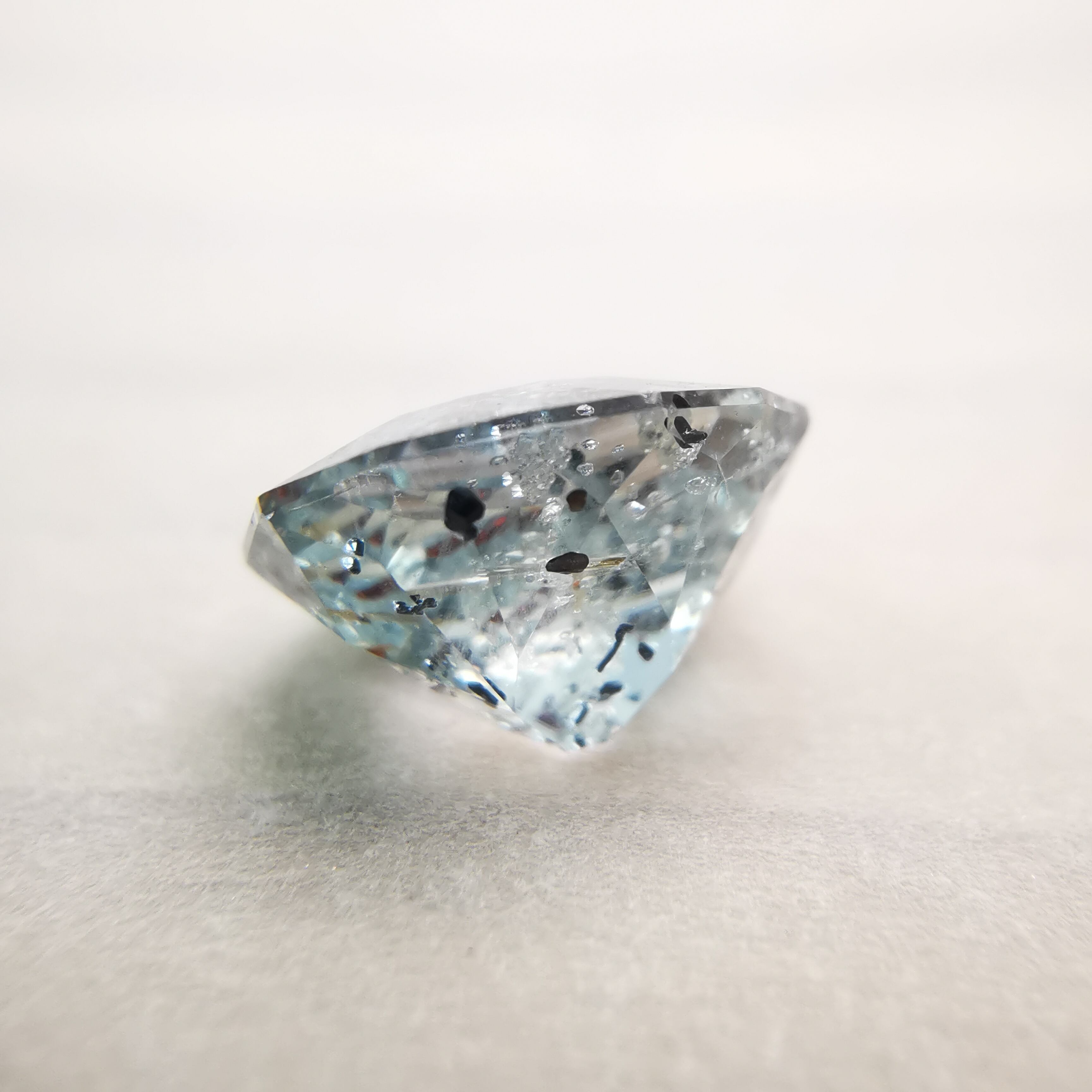 少しシルキーでカラーレスに近い、ごく淡い緑みブルーのサファイアに、様々なインクルージョンが入っています。
