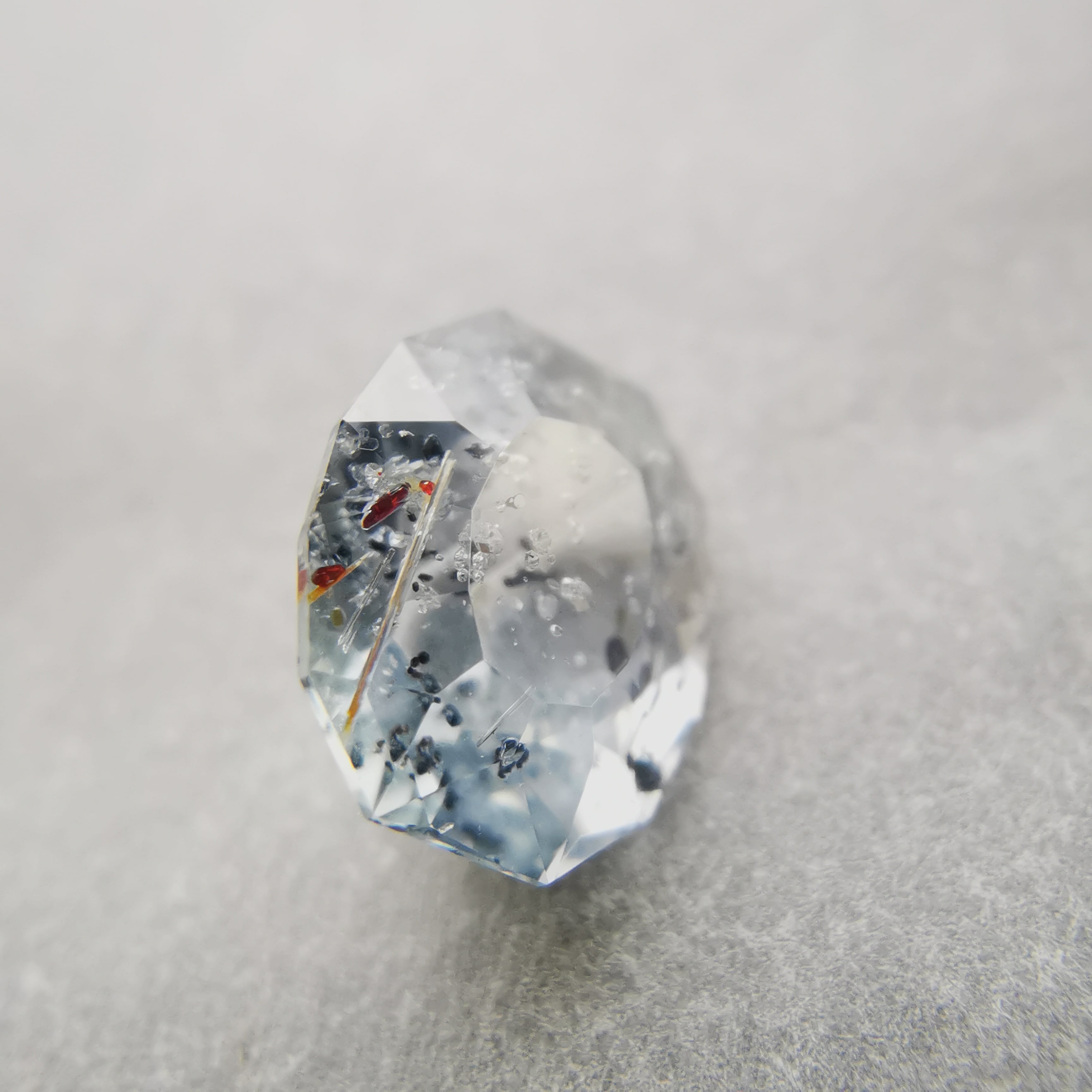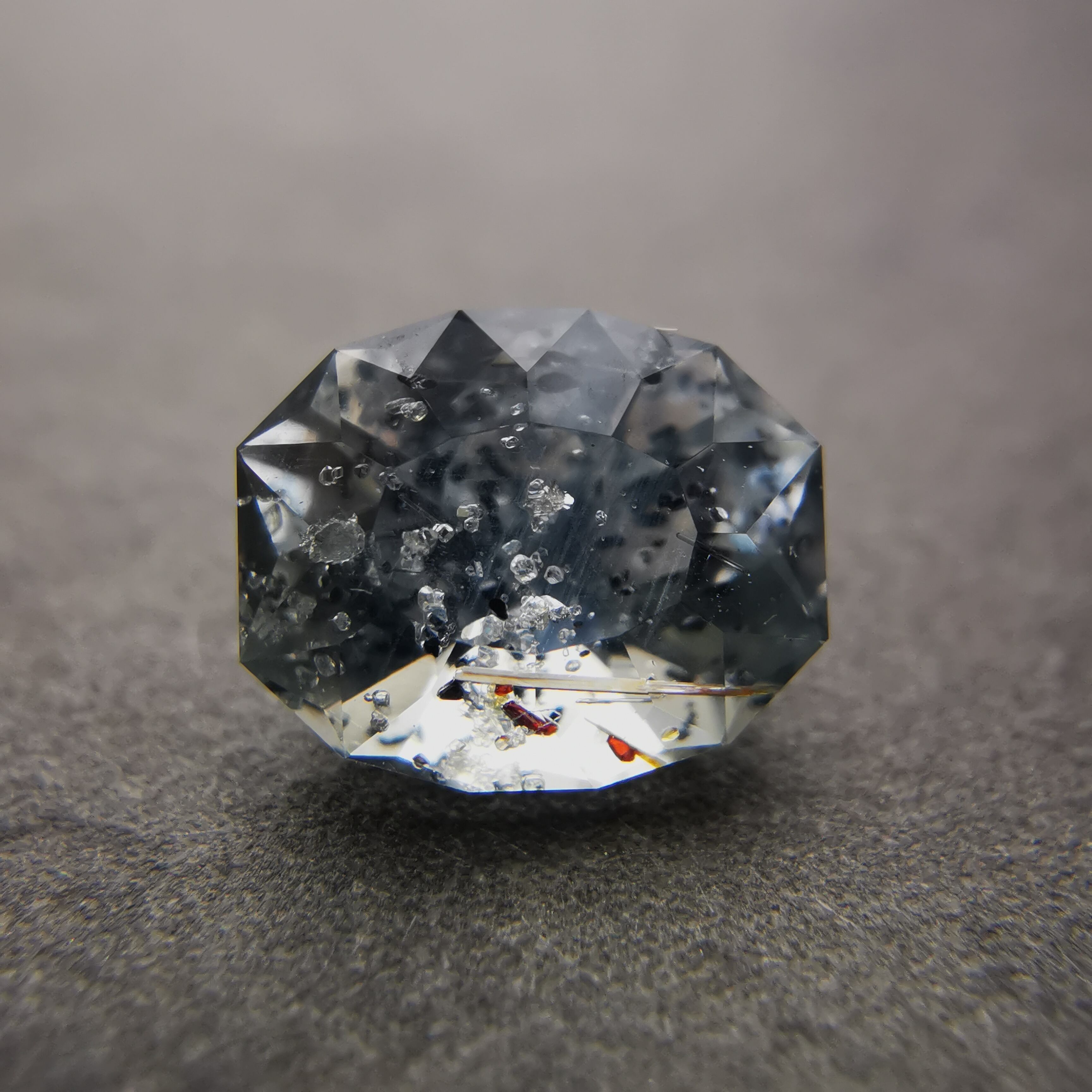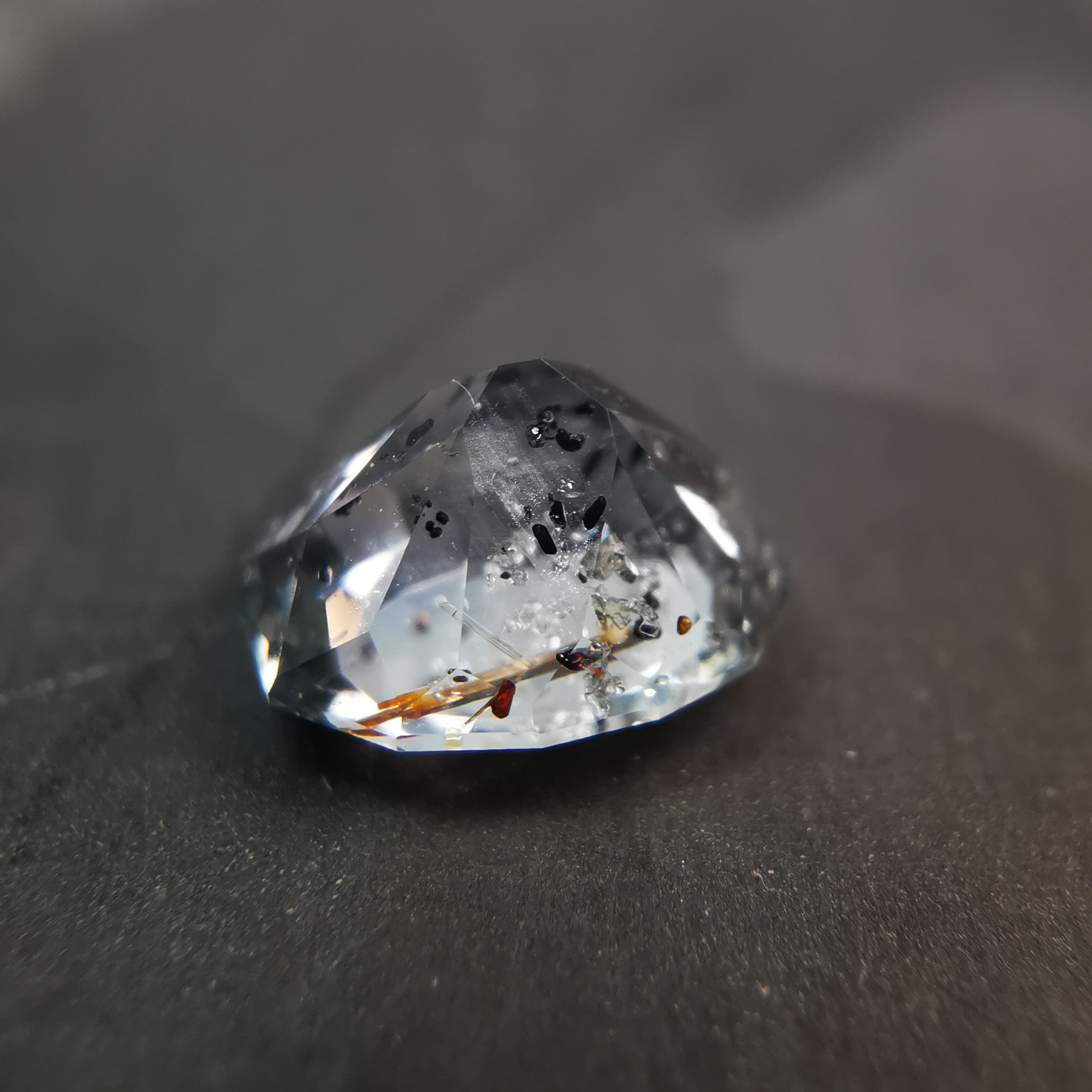 表面近くにある白い泡のような内包物はアパタイト、赤と黒のつぶつぶした内包物はルチル、ガードルの近くを走る黄色い筋状の内包物は酸化鉄だろうとのことです。