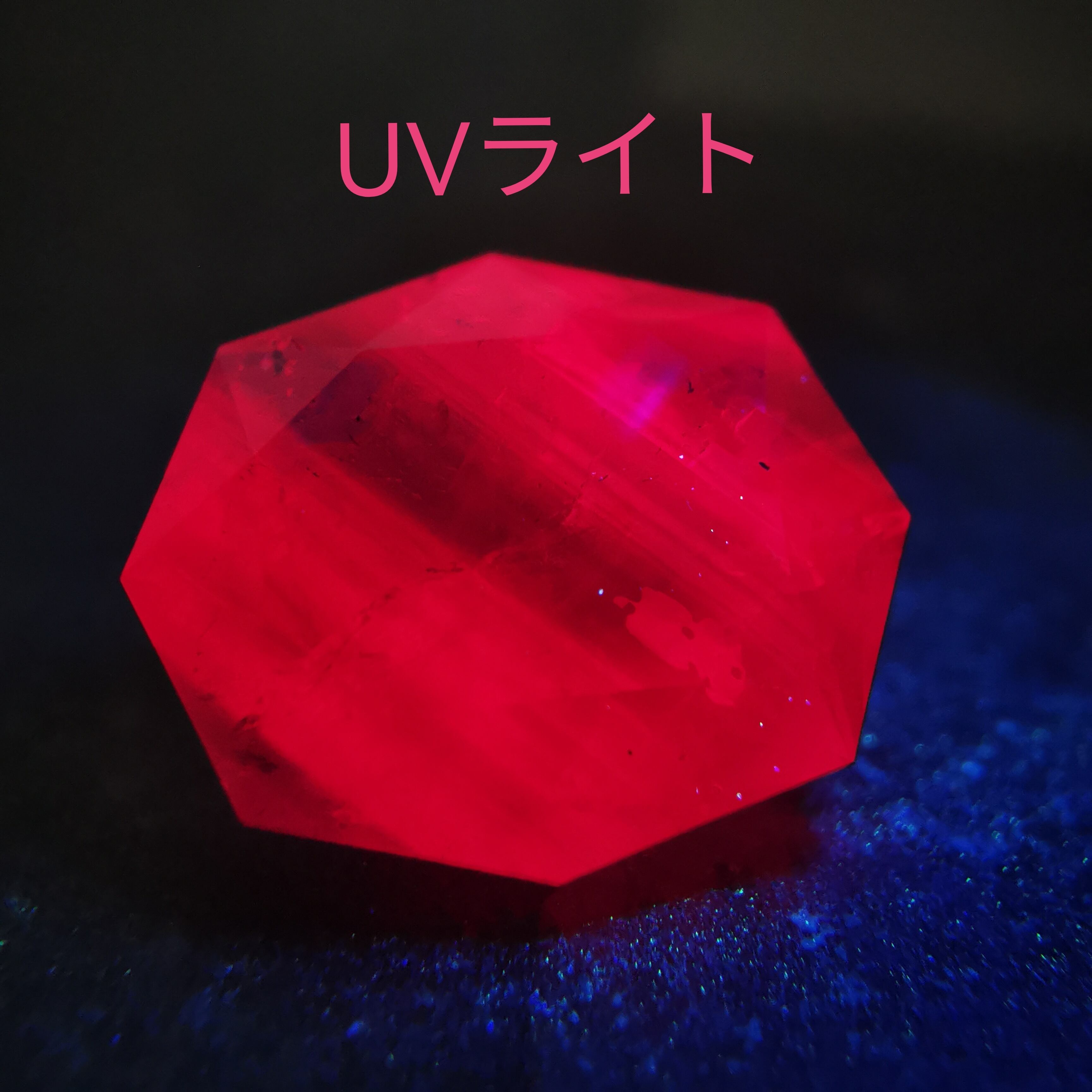 UVライトて照らすと、紫みの部分は真っ赤に蛍光、青みの部分は暗く縞の模様になります。