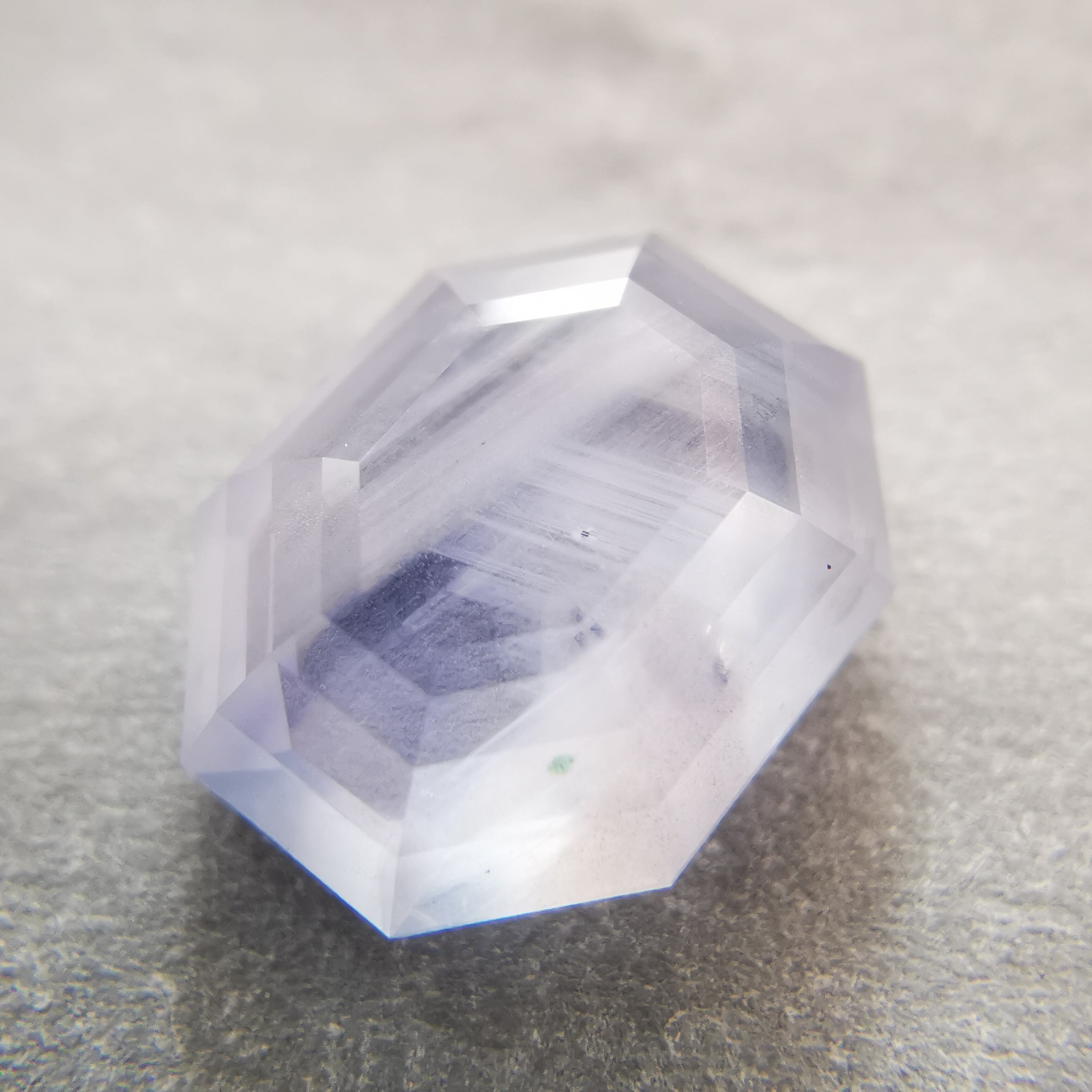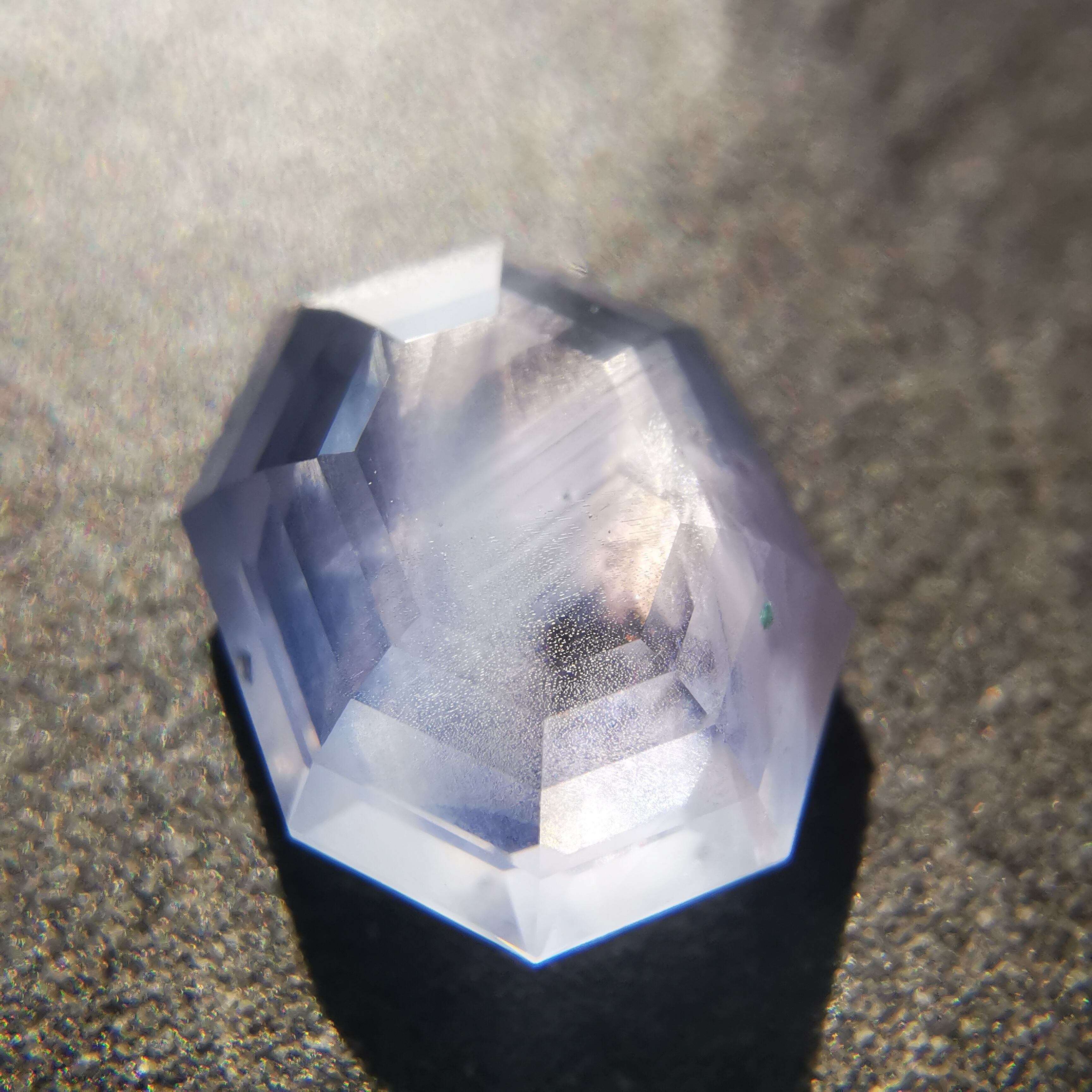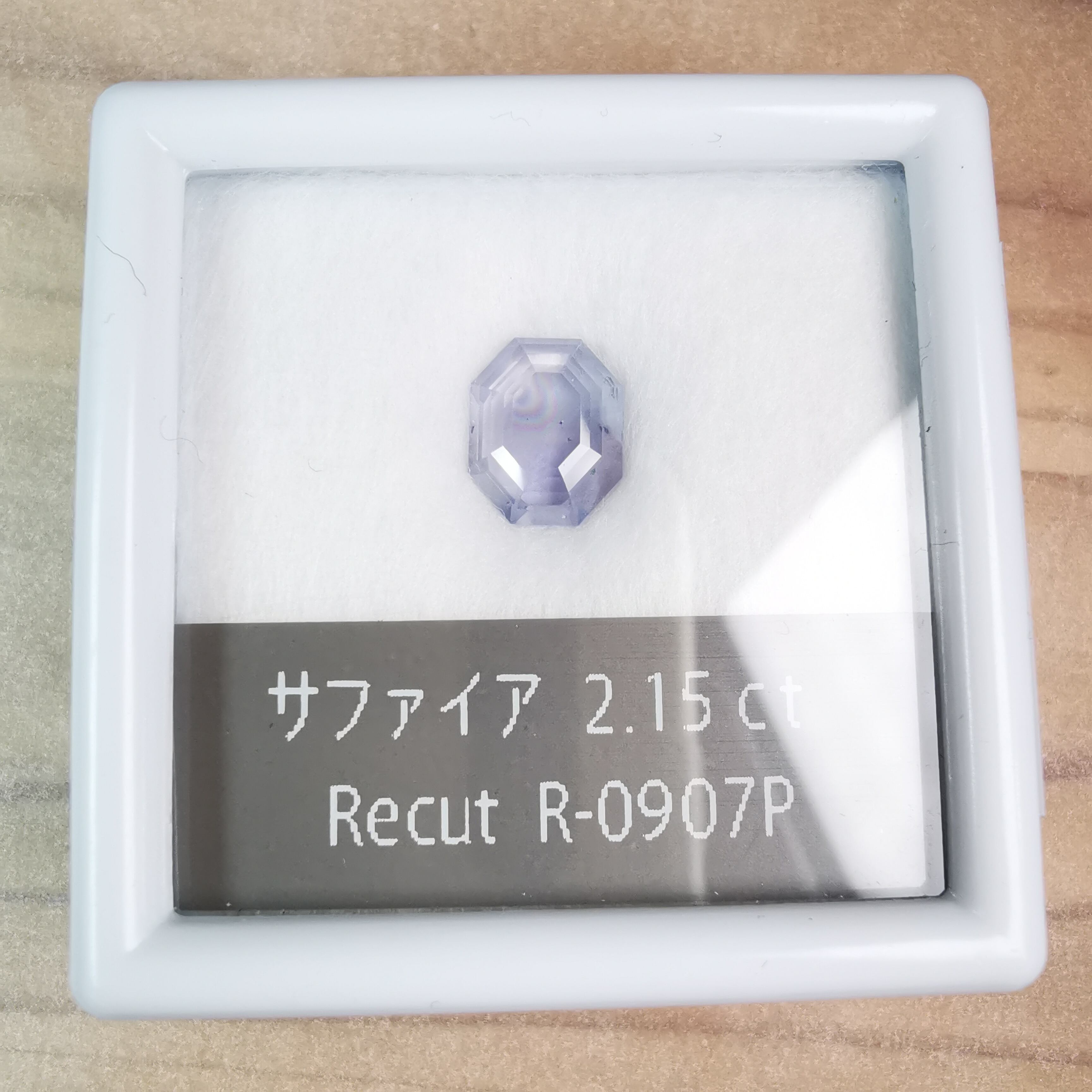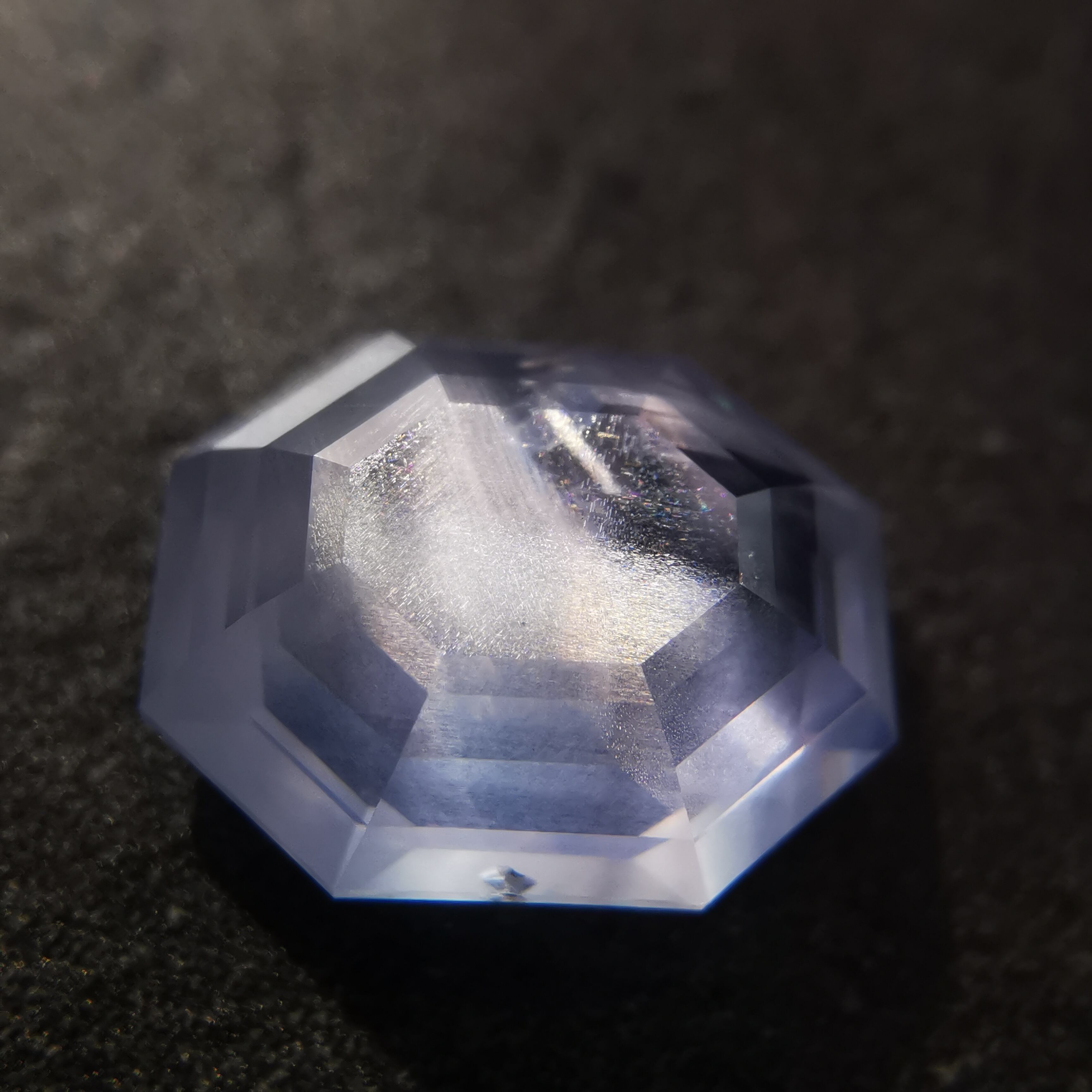 元はカボションカットのスターサファイアでしたが、スターサファイアにしてはかなり透明度が高かったため、弱いスターよりも、濃厚なシルクのきらめきを楽しめるように方向転換しようと考え、テーブル面のあるフラットバックカットにリカットしました。