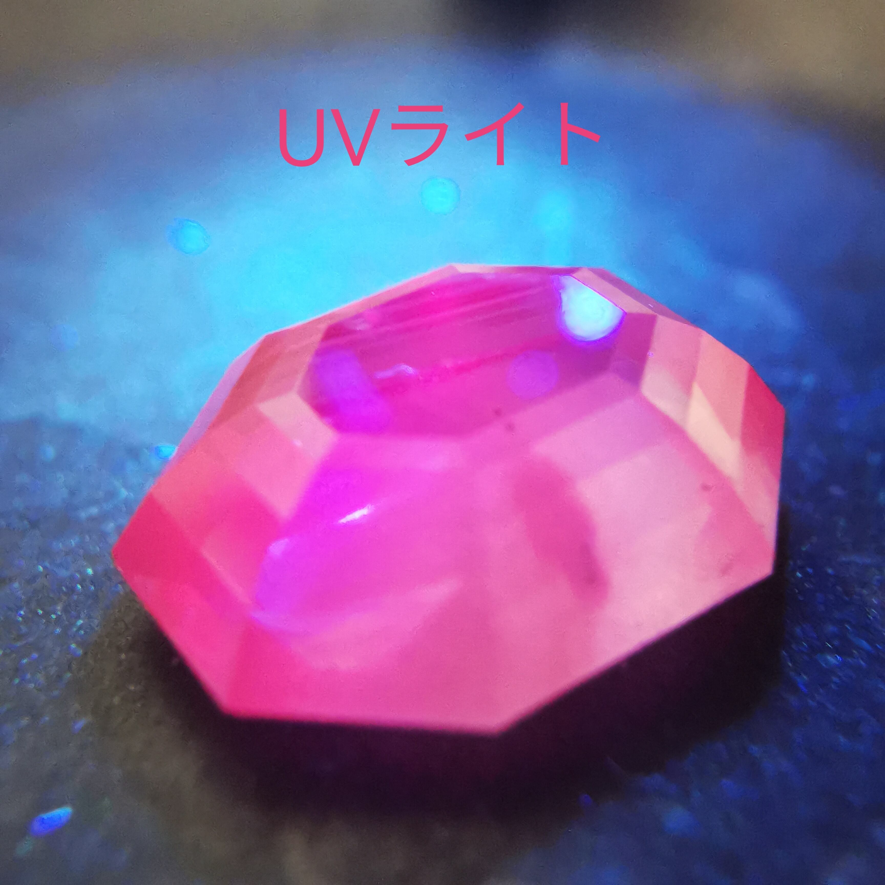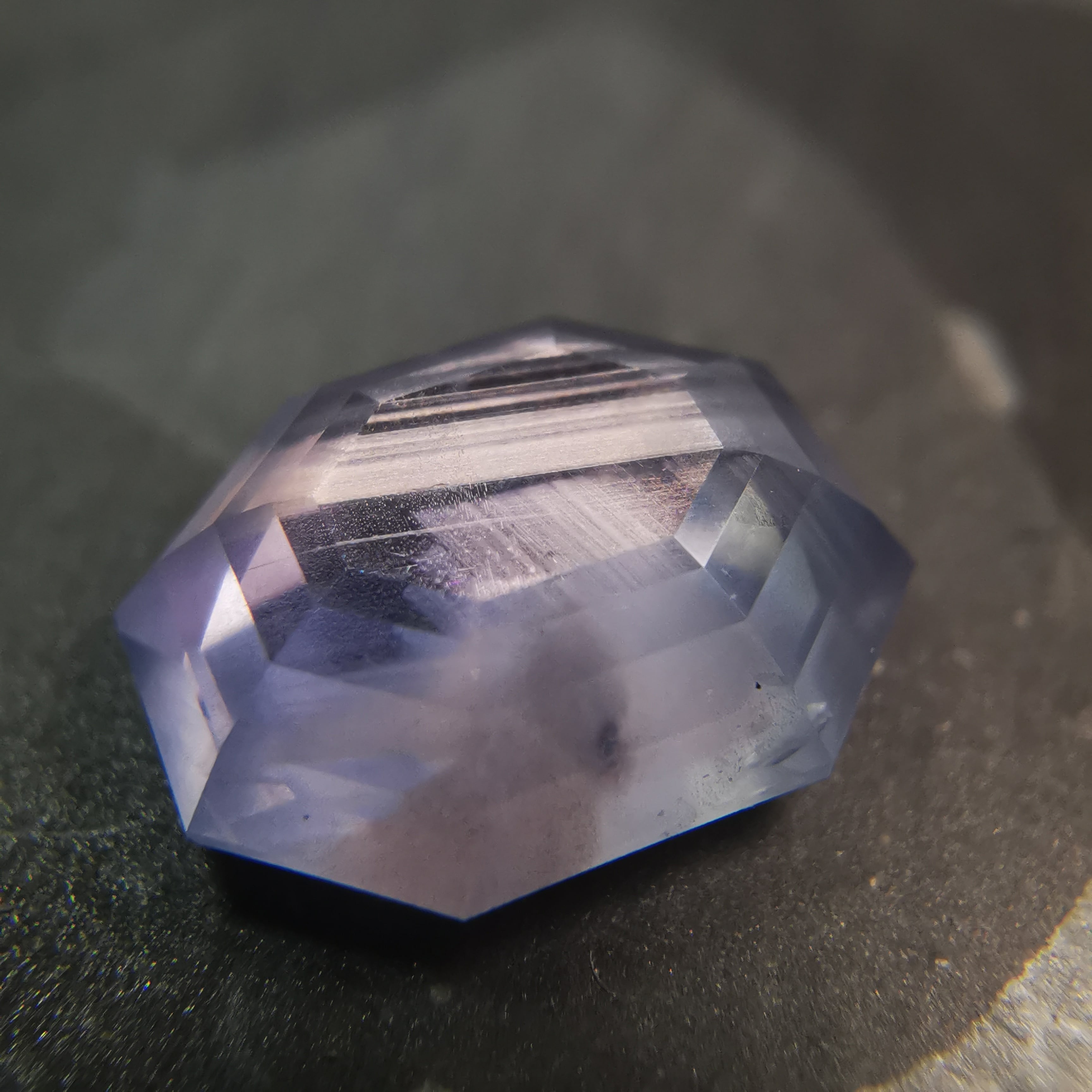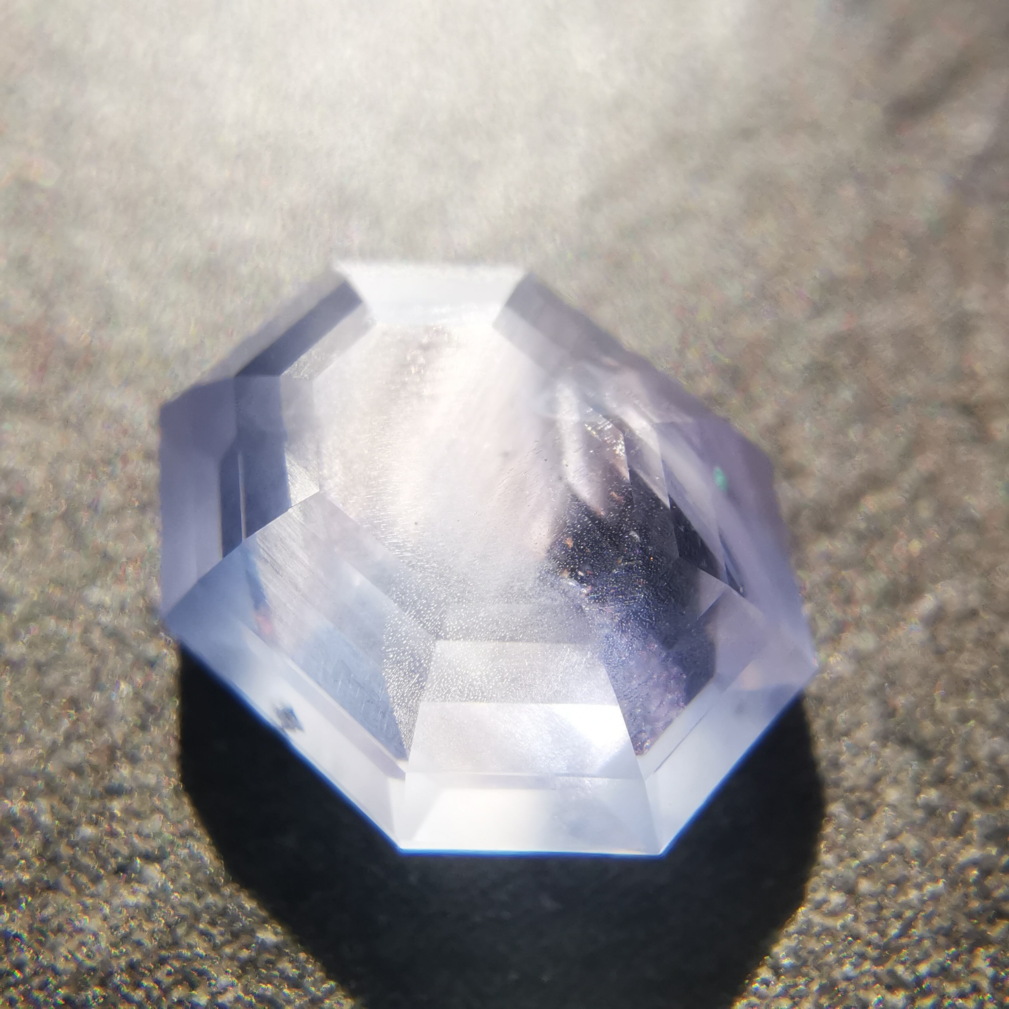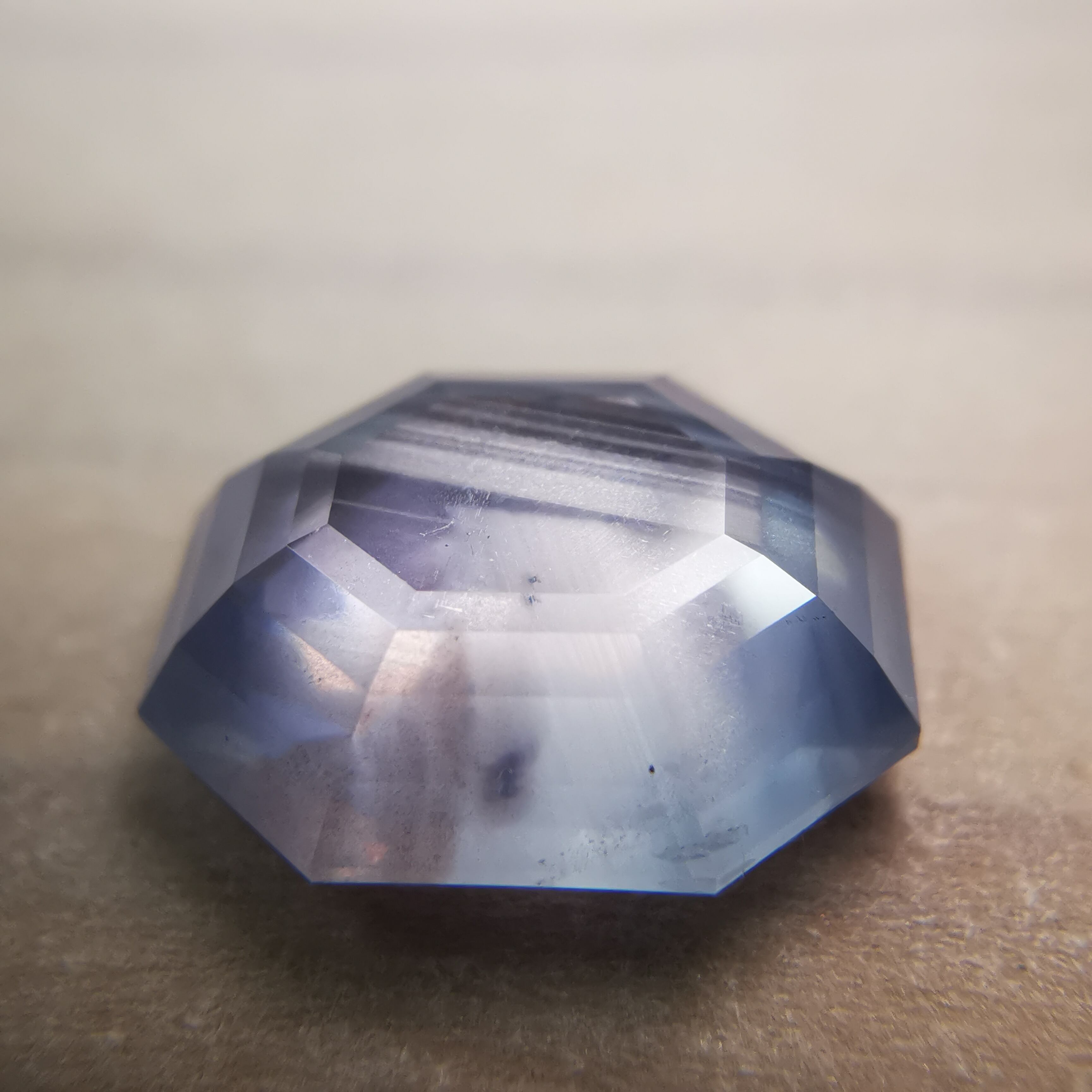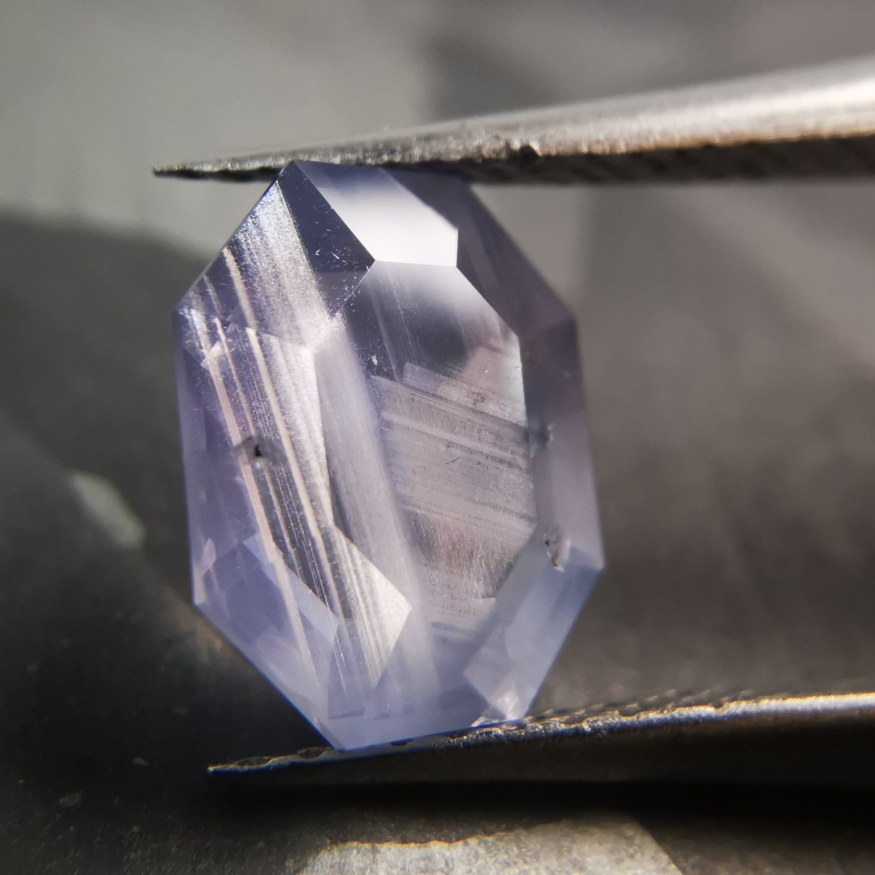 元はカボションカットのスターサファイアでしたが、スターサファイアにしてはかなり透明度が高かったため、弱いスターよりも、濃厚なシルクのきらめきを楽しめるように方向転換しようと考え、テーブル面のあるフラットバックカットにリカットしました。