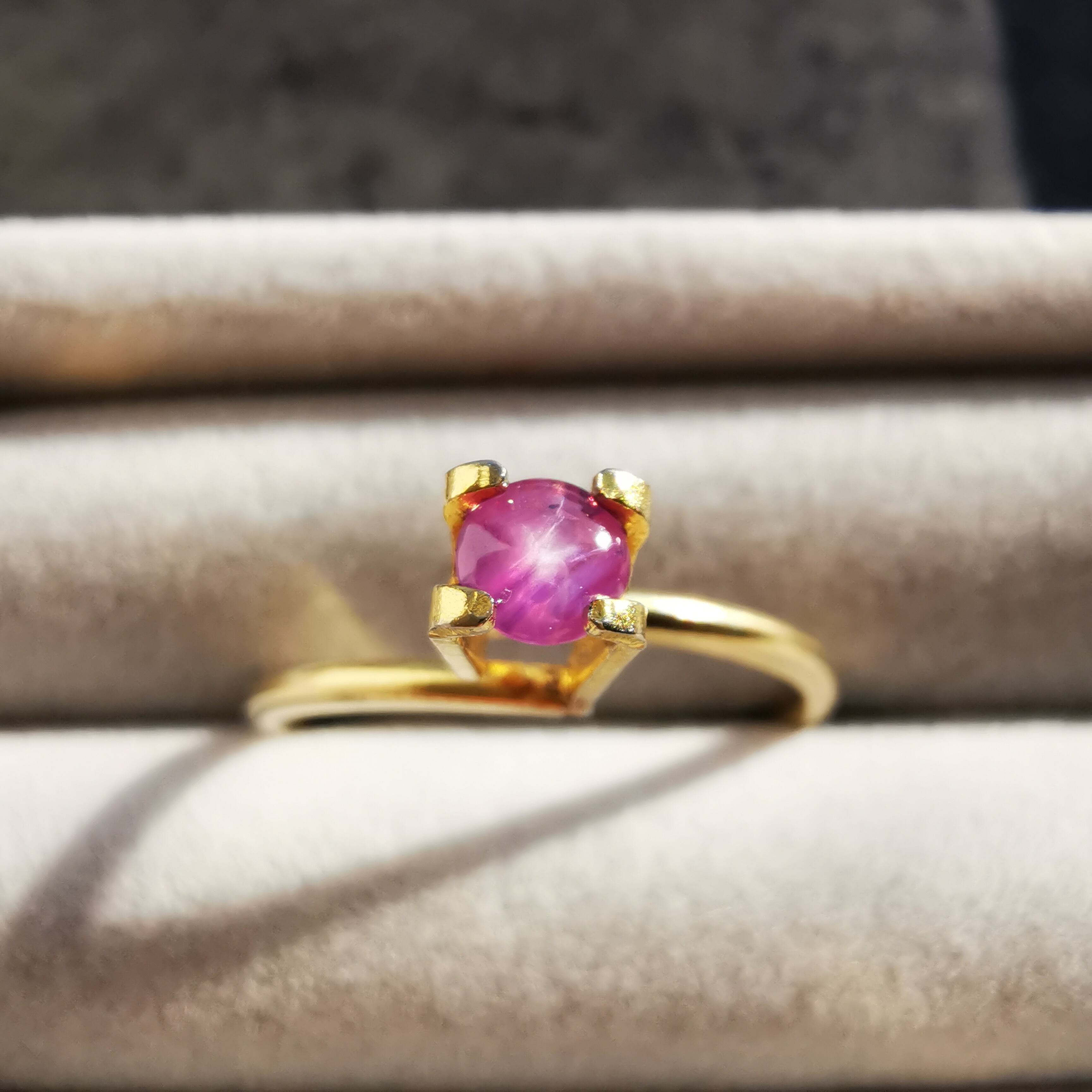 通常カボションカットのスターサファイアを、なぜわざわざ石目を大きく減らすバフトップにするのか、この一石がまさに答えです。